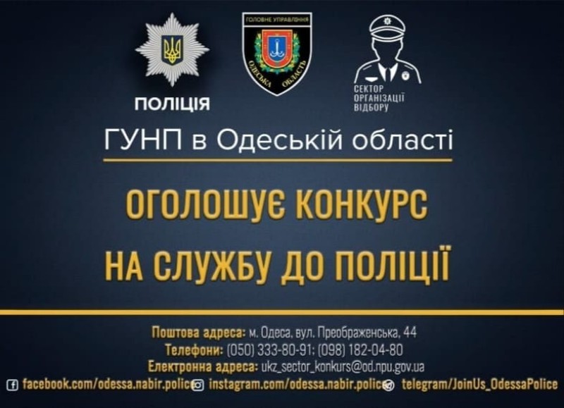 Документи подаються до сектору організації відбору УКЗ ГУНП в Одеській області за адресою: м. Одеса, вул. Преображенська, буд. 44, 2 поверх, кабінет № 32 та 34, тел. 050-333-80-91, 098-182-04-80, або соціальних мереж Facebook (https://www.facebook.com/odessa.nabir.police) та Instagram (@odessa.nabir.police).