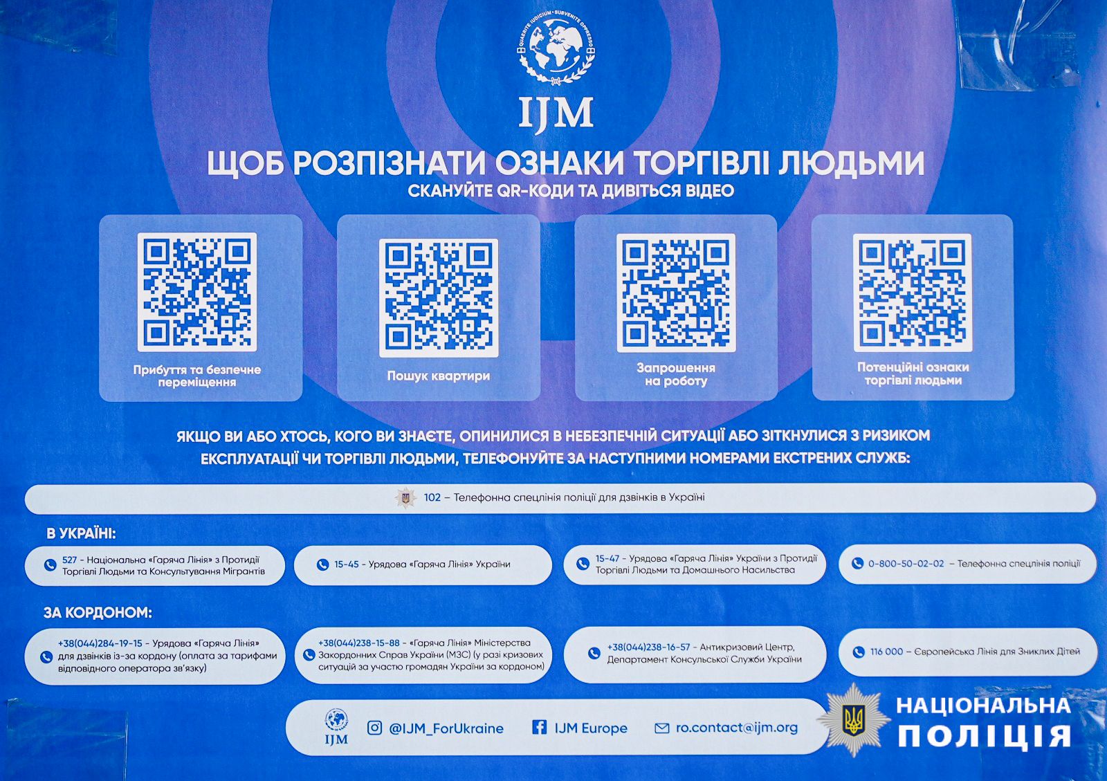 Якщо ви стали жертвою торгівлі людьми чи вам відомо про такі випадки, звертайтеся на спецлінію 102, а також на Національну гарячу лінію з питань протидії торгівлі людьми за номером 527.
