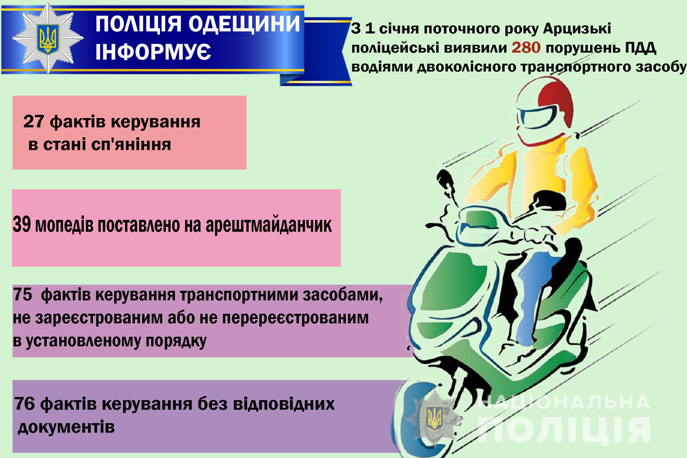 З початку року Арцизькими поліцейськими було виявлено 280 порушень правил дорожнього руху водіями мототранспорту. Найчастіші серед них - керування у нетверезому стані, без відповідних документів та на транспортних засобах без номерних знаків.