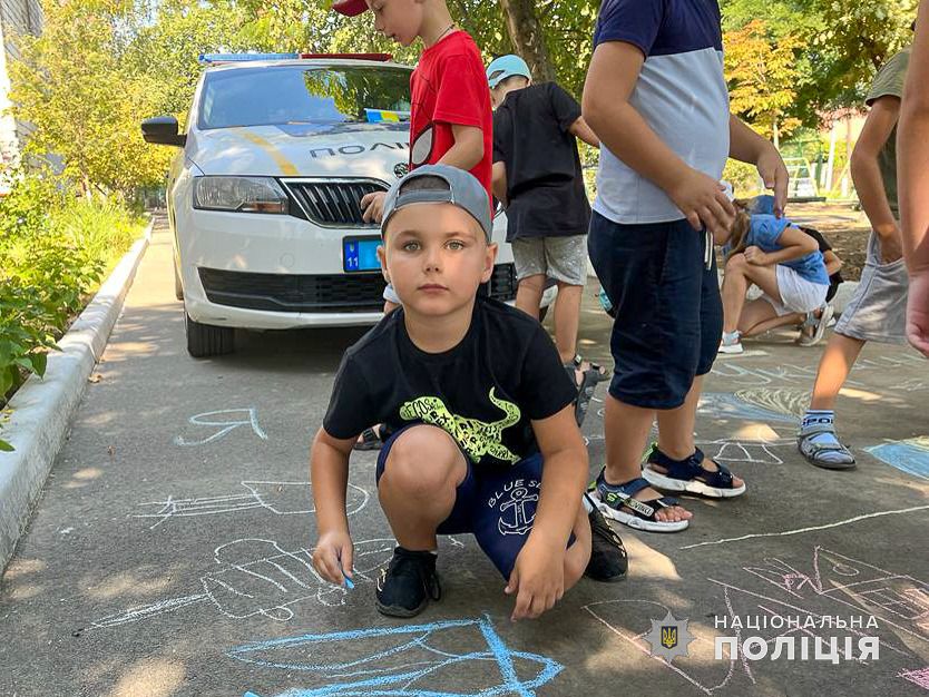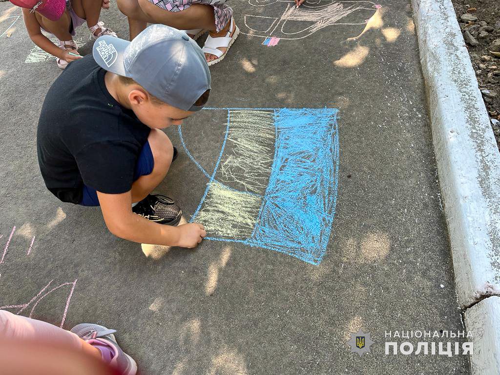 В ході розповіді про День народження нашої Держави, що відзначається щороку 24 серпня, поліцейські запропонували маленьким громадянам намалювати крейдою державні символи.