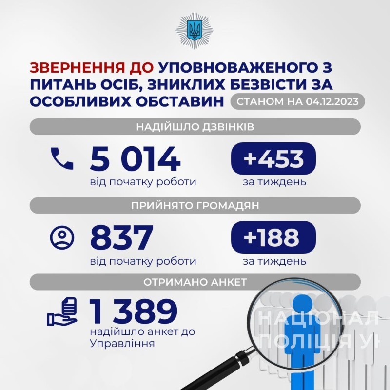 У середньому - це 93 дзвінків на добу. За останній тиждень кількість дзвінків сягнула понад 453. За час роботи до Управління надійшло понад 1389 анкет на осіб, зниклих безвісти за особливих обставин. Це сприяє верифікації осіб в Реєстрі та координації розшуку таких осіб.