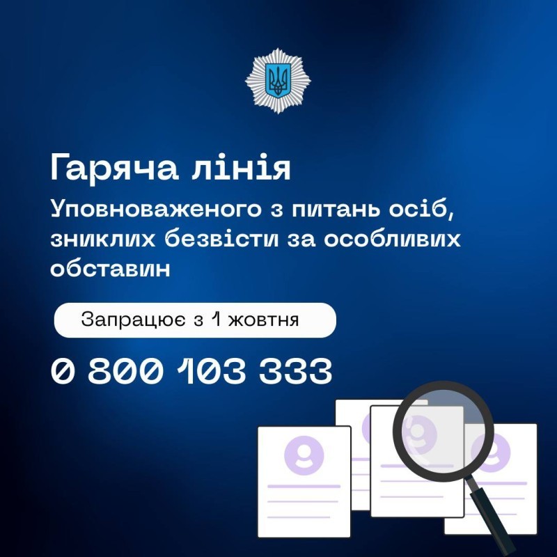 "З 1 жовтня Міністерство внутрішніх справ запускає Гарячу лінію Уповноваженого з питань осіб, зниклих безвісти за особливих обставин. Номер гарячої лінії – 0800103333. Оператори надаватимуть інформацію щодо роботи Єдиного реєстру осіб, зниклих безвісти за особливих обставин. Також консультуватимуть родичів зниклих безвісти та формуватимуть анкети до Уповноваженого з питань зниклих безвісти за особливих обставин", — написав у своєму Telegram-каналі Міністр внутрішніх справ України Ігор Клименко.