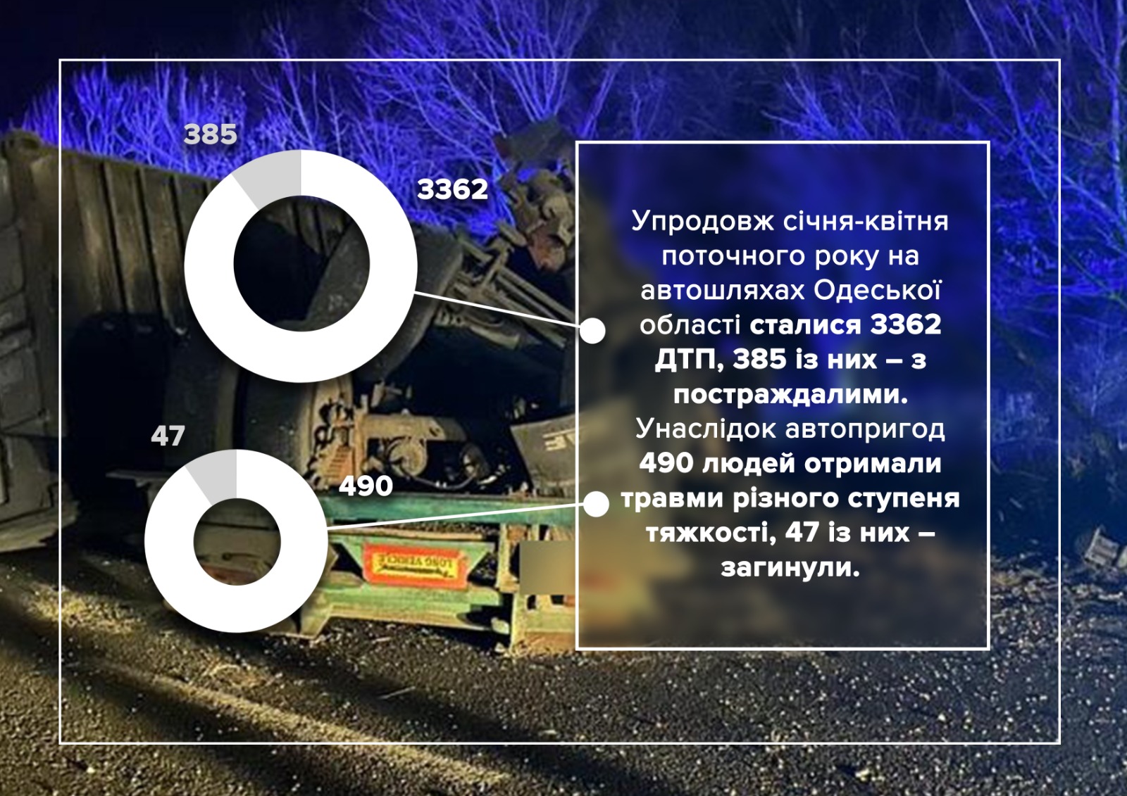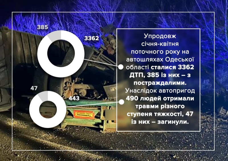 Упродовж січня-квітня поточного року на автошляхах Одеської області сталися 3362 ДТП, 385 із них – з постраждалими. Унаслідок автопригод 490 людей отримали травми різного ступеня тяжкості, 47 із них – загинули.