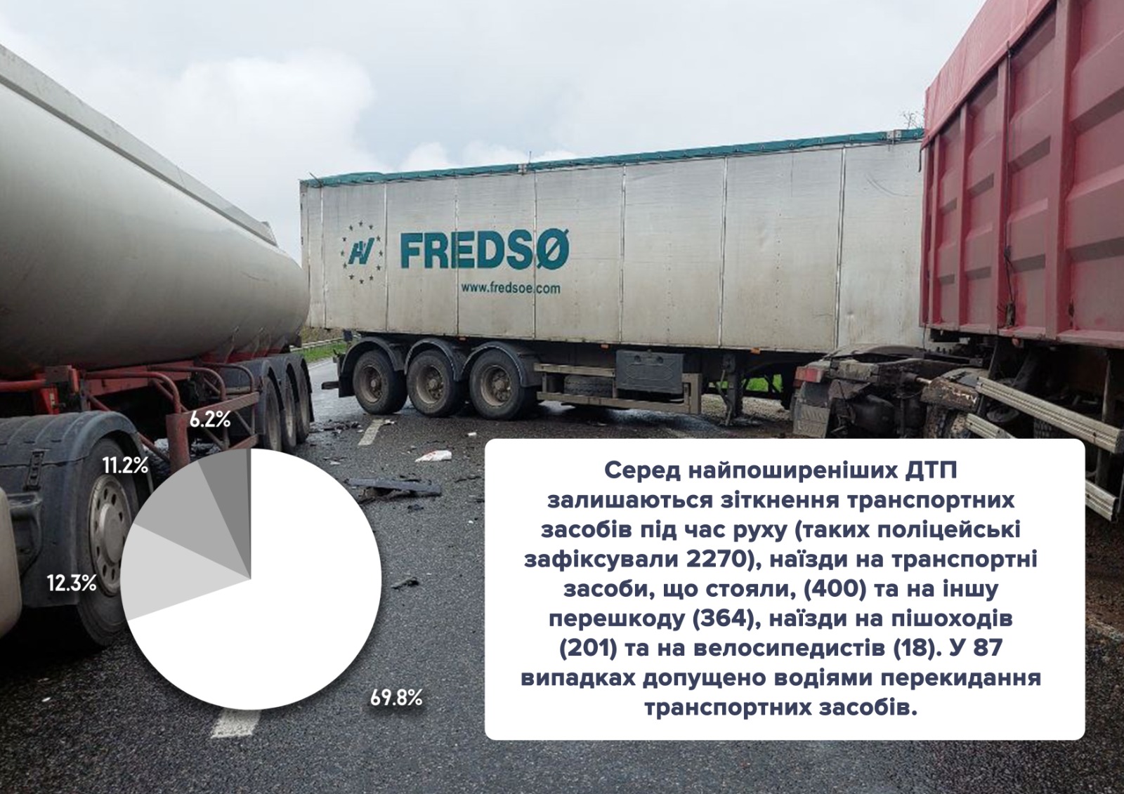 Серед найпоширеніших ДТП залишаються зіткнення транспортних засобів під час руху (таких поліцейські зафіксували 2270), наїзди на транспортні засоби, що стояли, (400) та на іншу перешкоду (364), наїзди на пішоходів (201) та на велосипедистів (18). У 87 випадках допущено водіями перекидання транспортних засобів.
