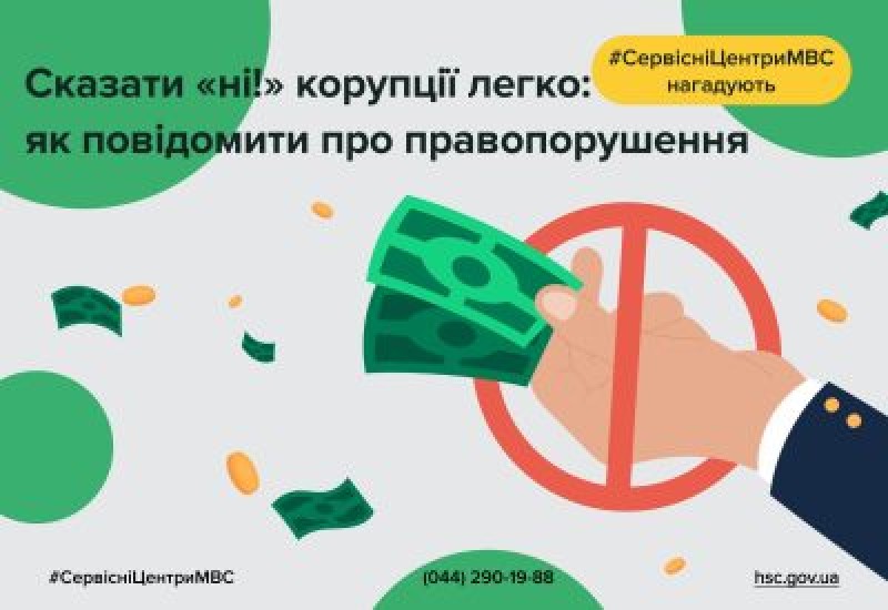 Якщо ви стали свідком корупції чи неправомірного вимагання коштів за державні послуги, не мовчіть! Головний сервісний центр МВС реалізовує антикорупційні програми та своєчасно реагує на можливі факти, пов’язані з такими діями. Ми створили надійні канали зв’язку, розміщені на нашому сайті у вільному доступі, за якими можливо звернутись:
