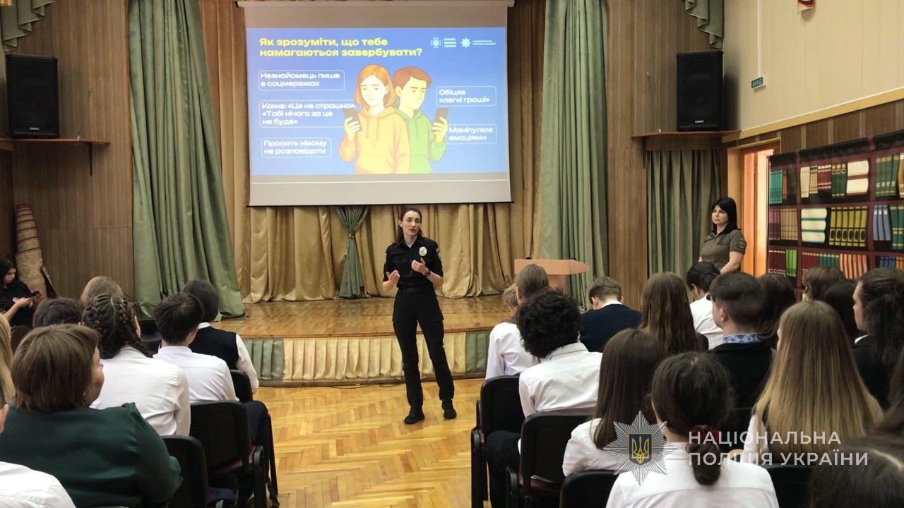 Начальниця відділу ювенальної превенції поліції Одещини Вікторія Чалова пояснила школярам, як саме діють вербувальники.