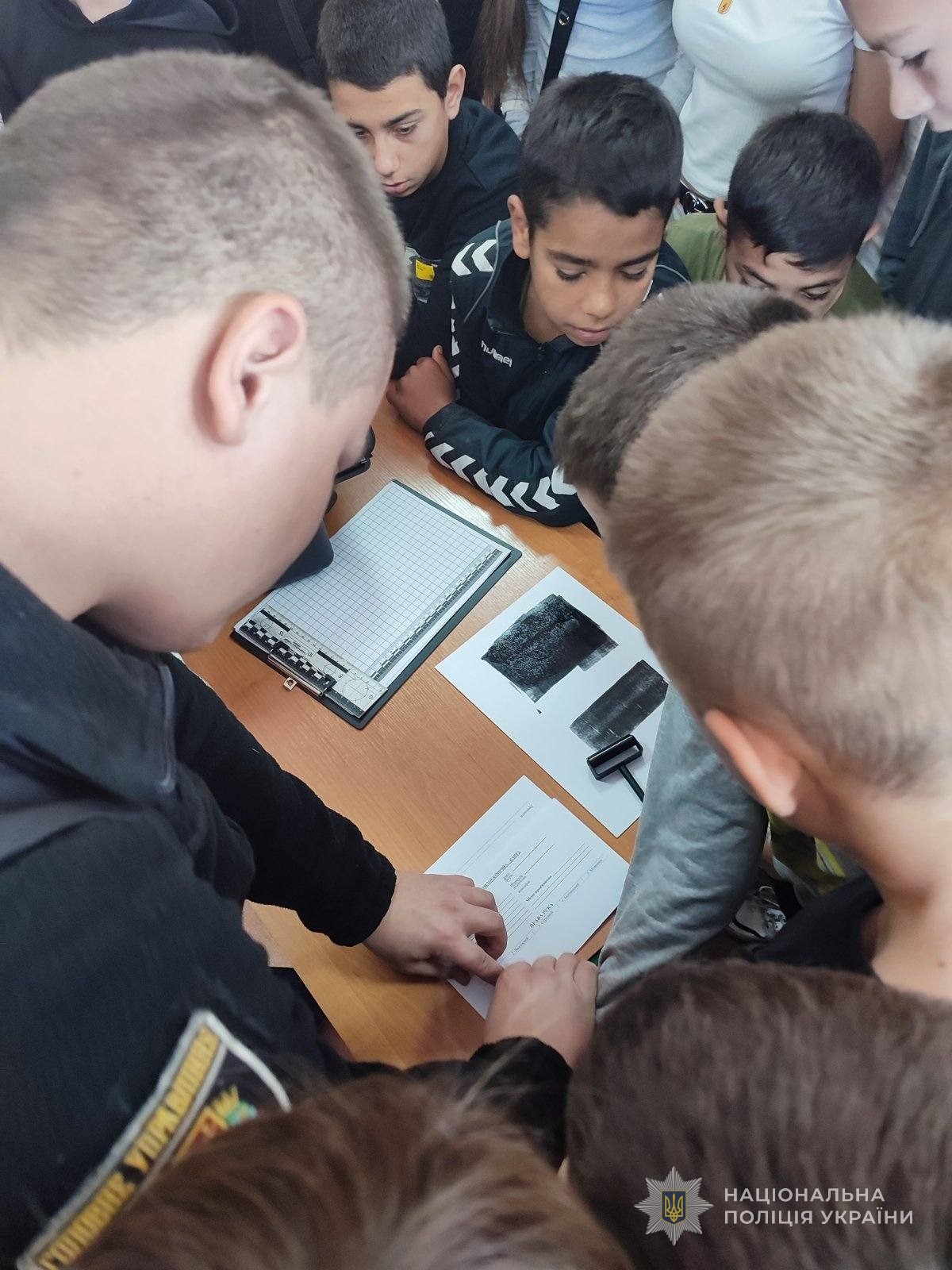 Також школярам розповіли про роботу поліцейських офіцерів громад та криміналістів. Діти з радістю взяли участь в уроці дактилоскопіювання, під час якого спробували зняти відбитки пальців за допомогою приладдя, що міститься в криміналістичній валізі.