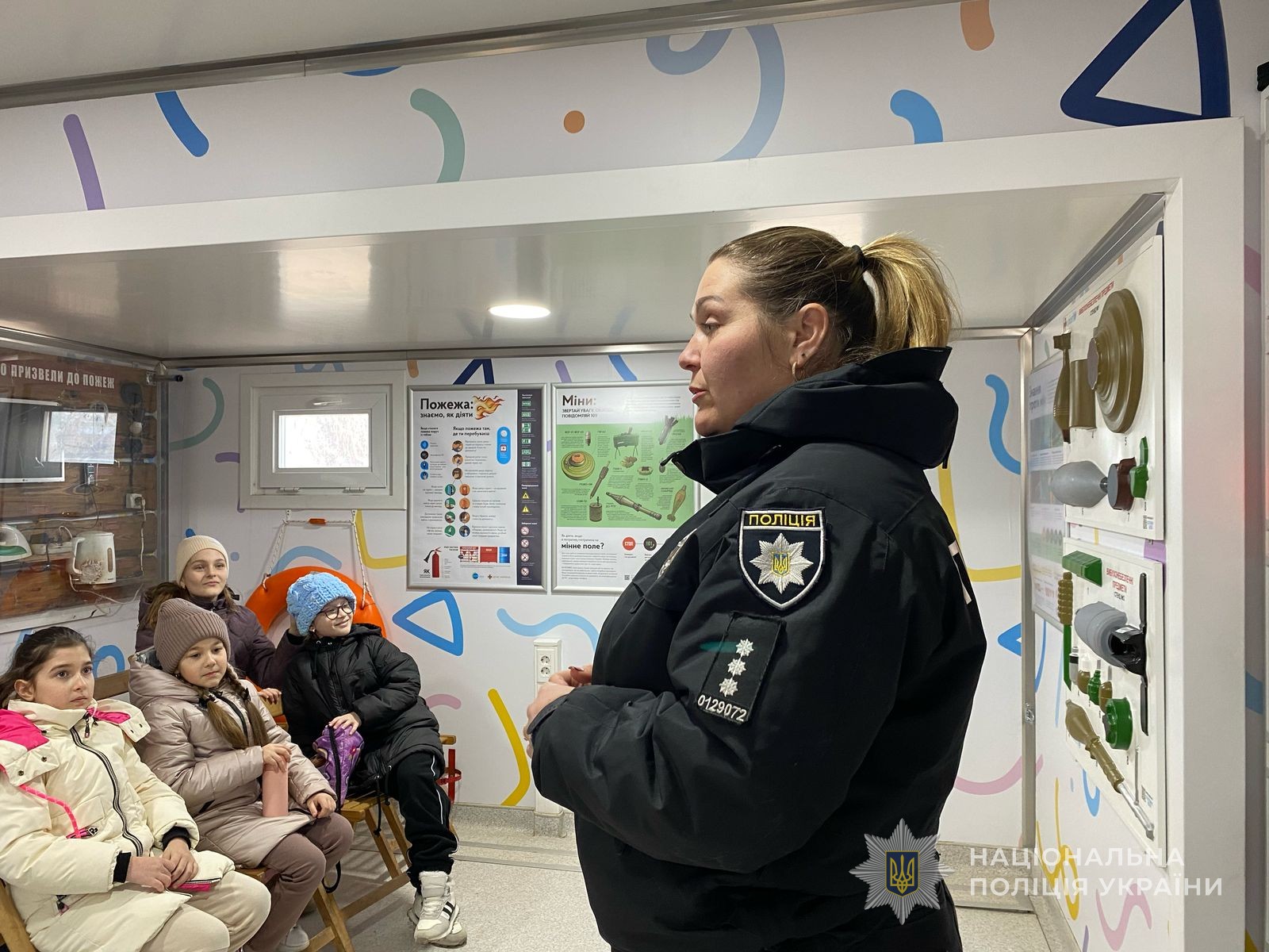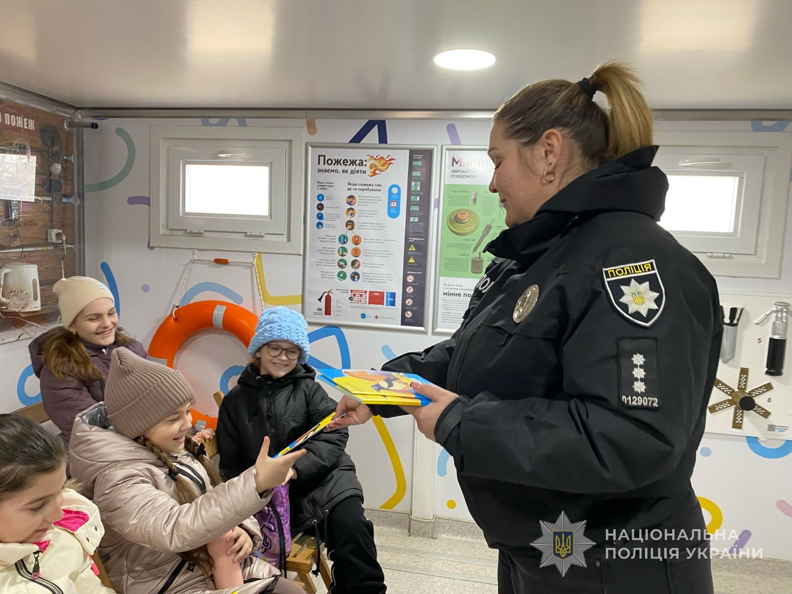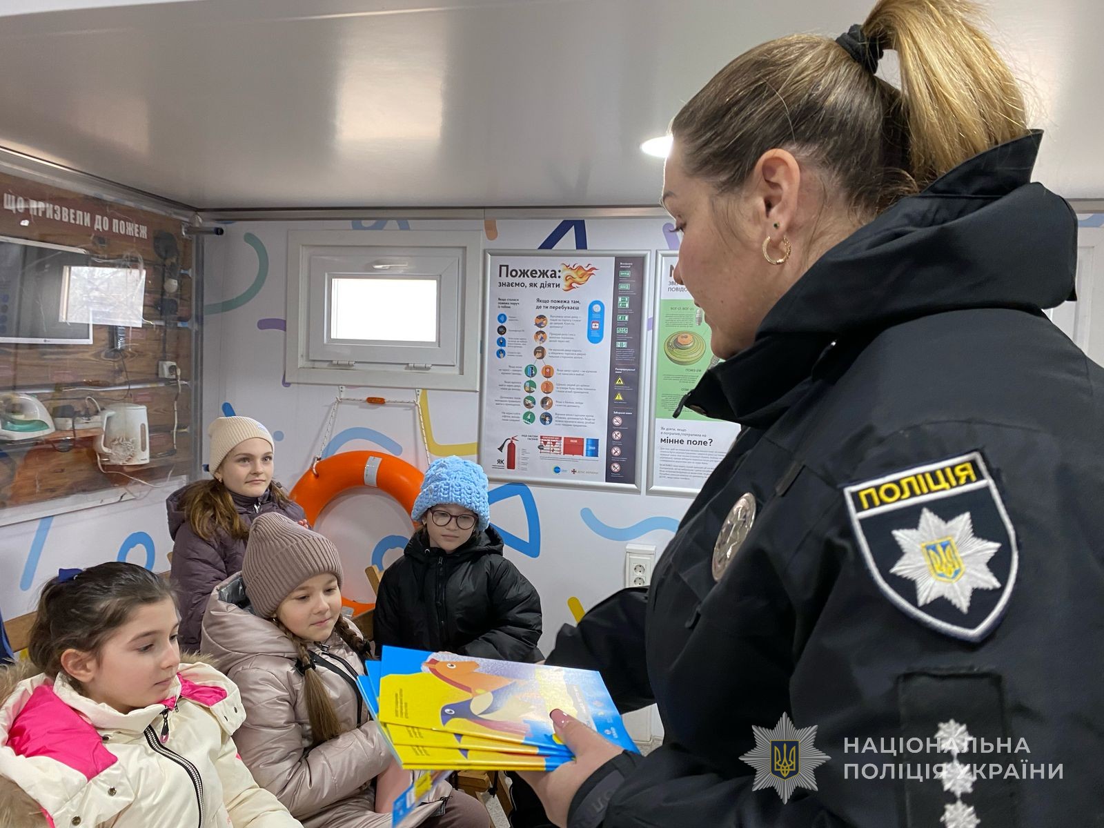 На Одещині поліцейські спільно з рятувальниками проводять уроки для дітей у мобільному класі безпеки