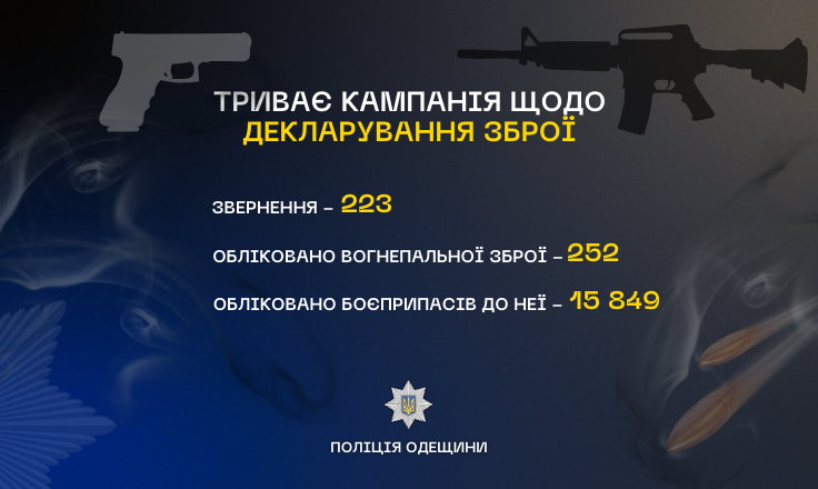 Як повідомив начальник відділу контролю за обігом зброї ГУНП в Одеській області Юрій Терещук, за трохи більше ніж три місяці поліцейські Одещини вже поставили на облік 252 одиниці вогнепальної зброї, серед якої автомати, карабіни, гладкоствольні рушниці, пістолети, а також 15 849 боєприпасів до неї.