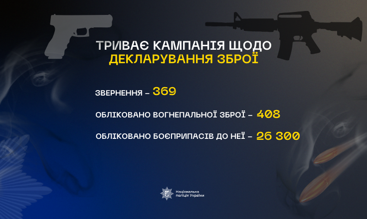 «Процедуру декларування пройшли 369 людей. Вони отримали відповідні документи і можуть зберігати зброю протягом дії воєнного стану – виключно для захисту України та українського народу від російської агресії. У подальшому можливе набуття права власності на неї, наприклад, шляхом перероблення на мисливську, або ж необхідно буде здати її до поліції.
