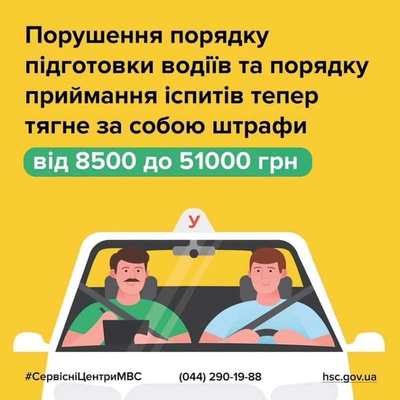 Порушення працівниками територіальних сервісних центрів МВС встановленого порядку приймання іспитів для отримання права керування транспортними засобами або видачі посвідчення водія — тягне за собою накладення штрафу від однієї тисячі до двох тисяч неоподатковуваних мінімумів доходів громадян. Тобто, зараз це суми від 17000 грн до 34000 грн.
