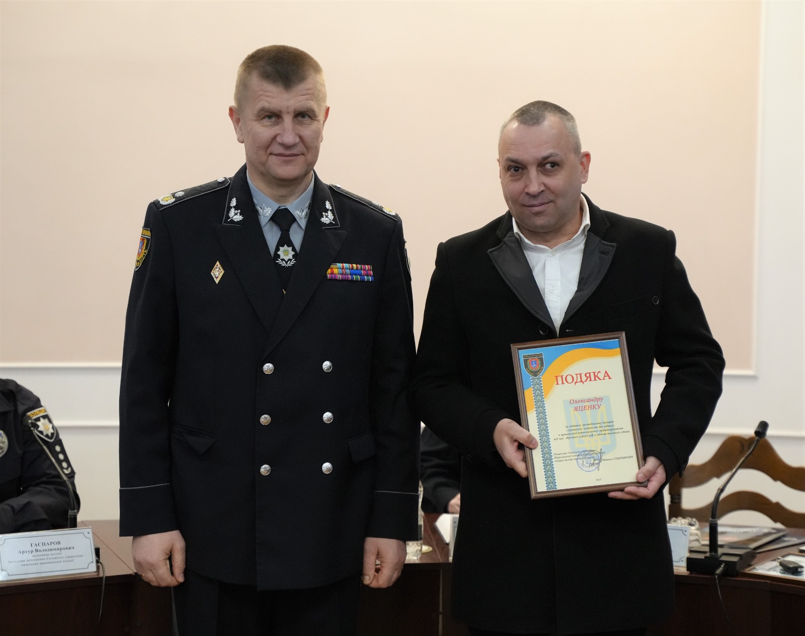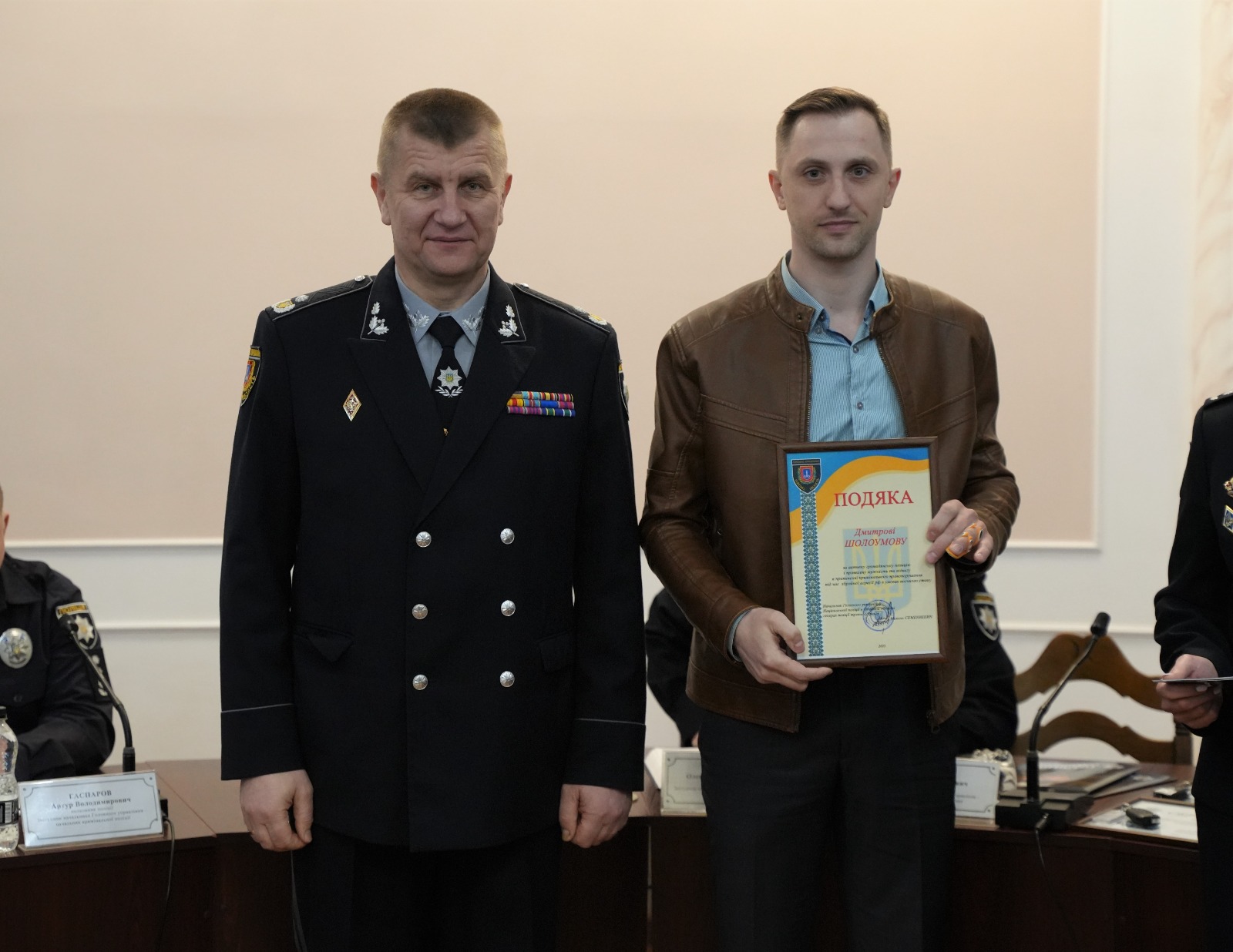 За активну громадянську позицію, проявлену мужність в припиненні кримінального правопорушення генерал поліції третього рангу вручив відзнаки Олександру Яценку та Дмитру Шолоумову.