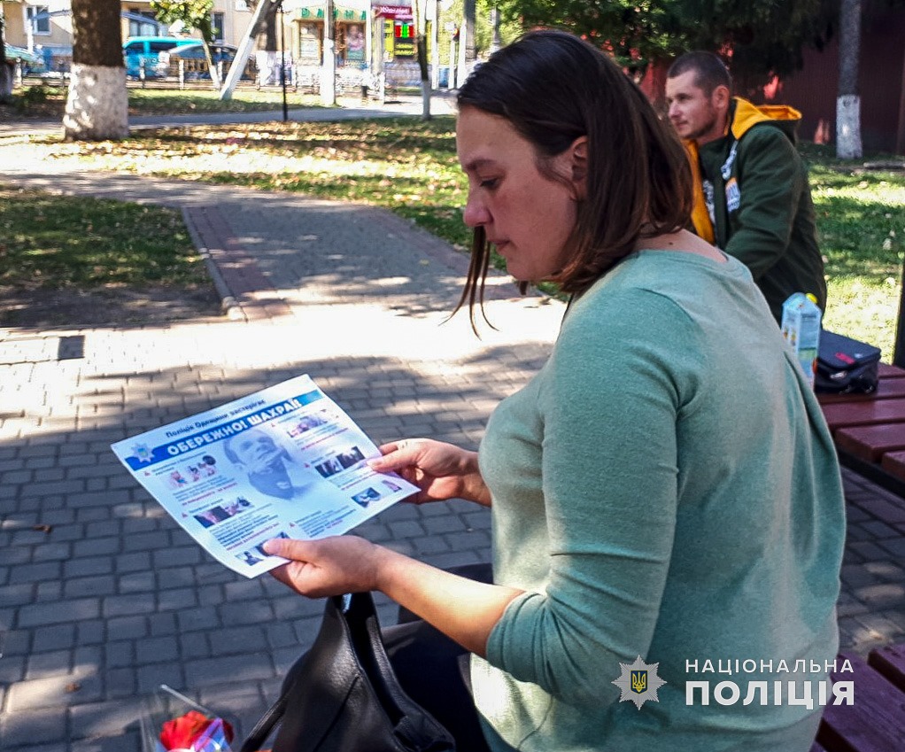 Цей захід правоохоронці провели разом із місцевими тележурналістами у парку «Слава праці». Правоохоронці намагаються розповісти якомога більшій кількості громадян як розпізнати та не потрапити до рук аферистів.