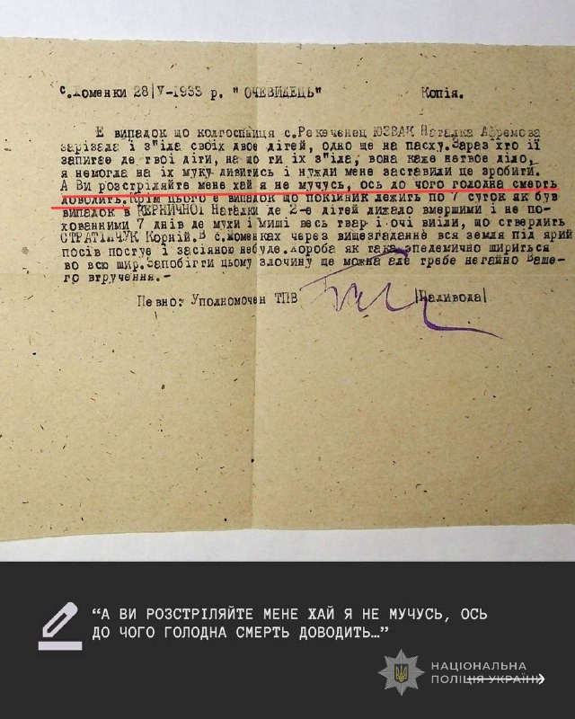 "Жахлива трагедія, яку неможливо забути та пробачити. Геноцид голодом. Жорстокий та цинічний злочин проти людяності.