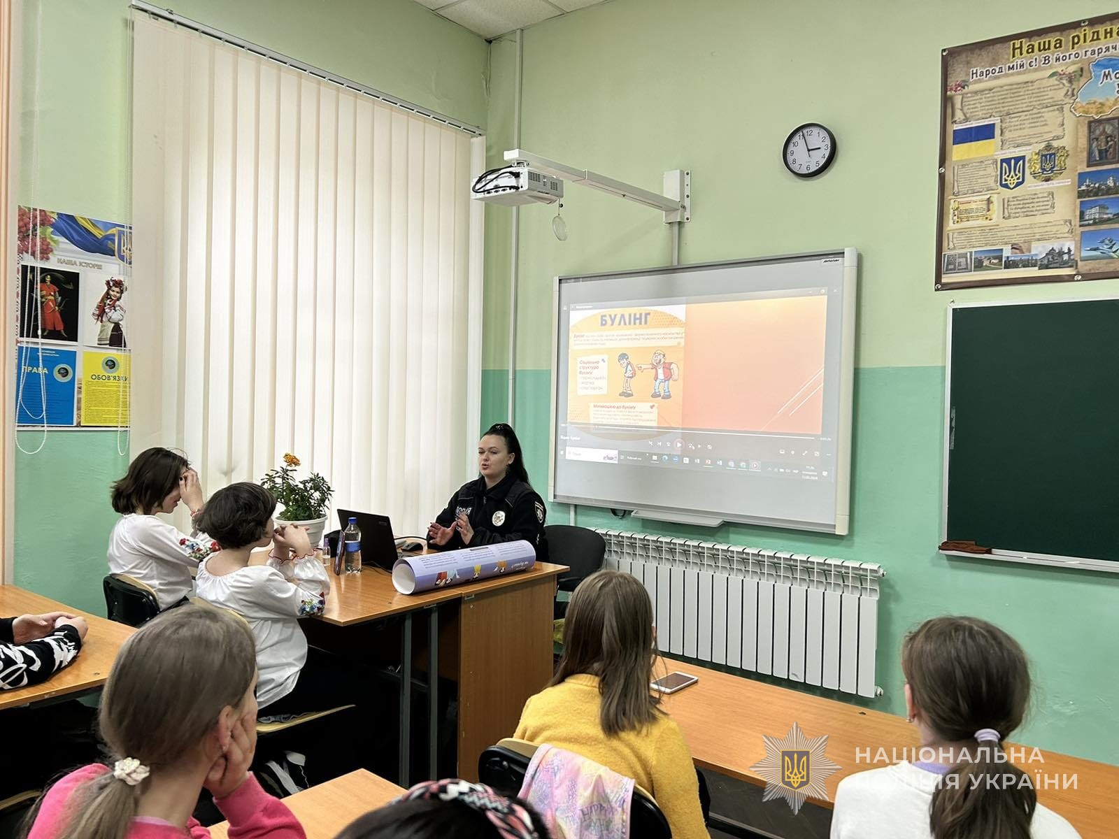 Говорили ювенали з дітьми і про булінг. За допомогою відеопрезентації, карток та інтерактивної тематичної гри ознайомили школярів із видами цього негативного явища (фізичним, вербальним, соціальним) та способами протидії. Наголосили, що агресивна поведінка, принижування або залякування один одного може нашкодити як психічному, так і фізичному здоров’ю неповнолітньої жертви цькування. І будь-яка дитина несподівано для себе може опинитись у ситуації, коли її ображають, висміюють, залякують, шантажують або бойкотують. Впоратися з агресією самотужки важко, тому необхідно звертатися по допомогу до батьків, вчителів, поліцейських.