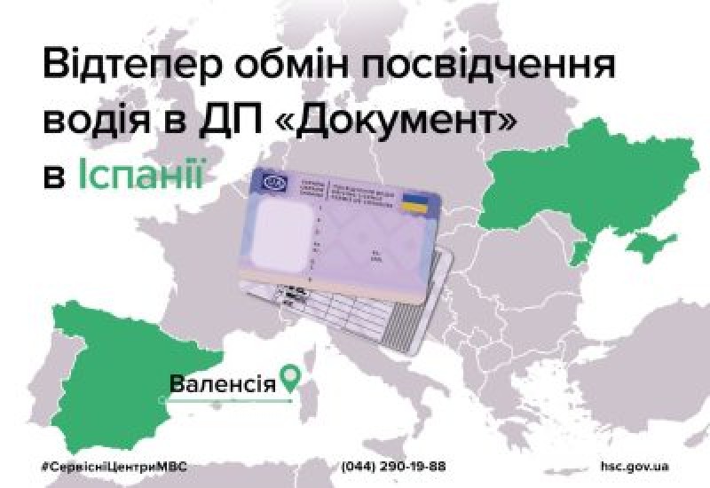 Від сьогодні послуга обміну посвідчення водія надається у центрі ДП «Документ» у Валенсії. Іспанія стала шостою країною, де можна отримати послугу обміну українського посвідчення водія на таке ж українське. А центр ДП «Документ» у Валенсії — десятий такий, у якому можна обміняти посвідчення водія та отримати інші державні послуги України за кордоном.