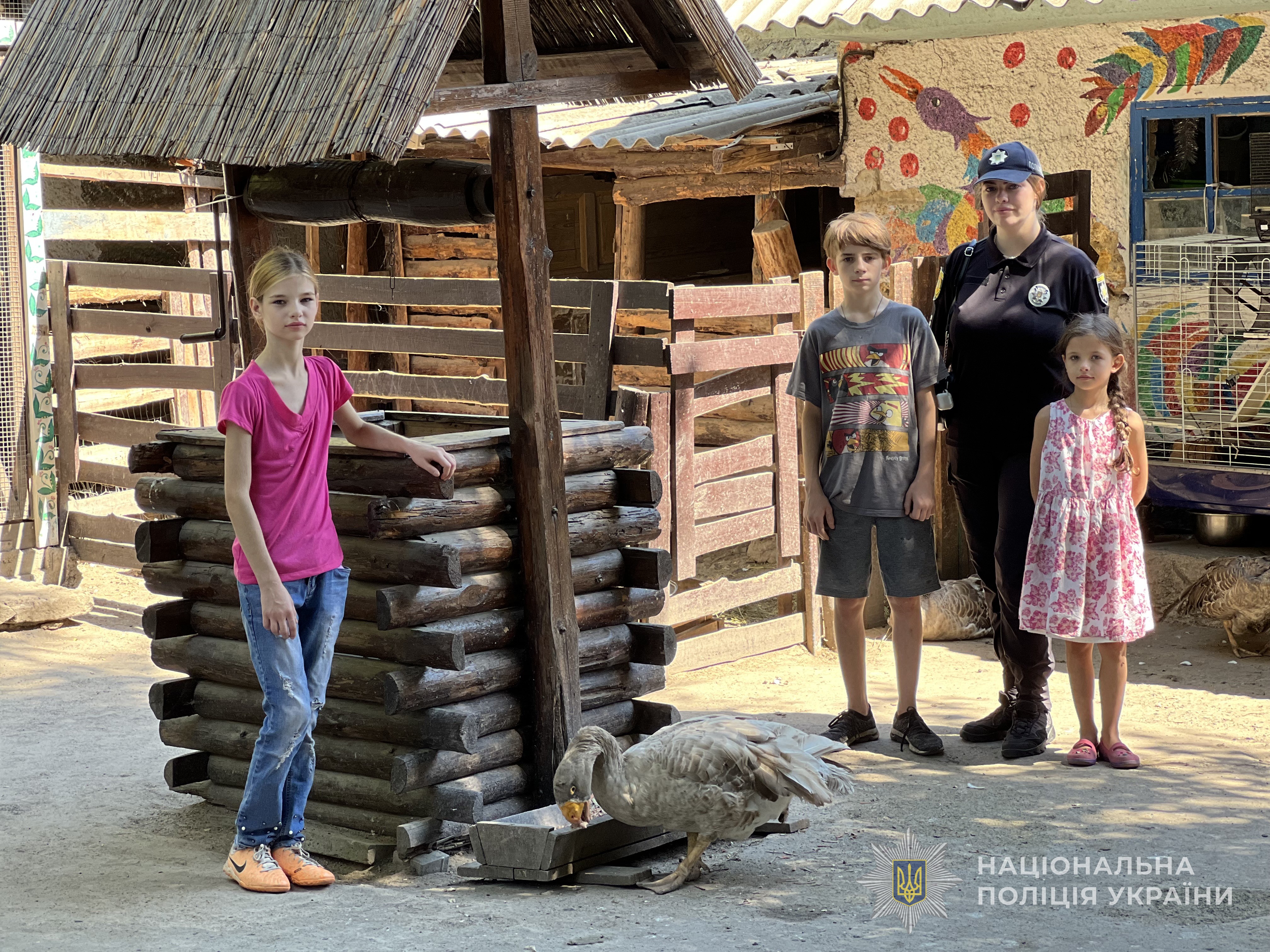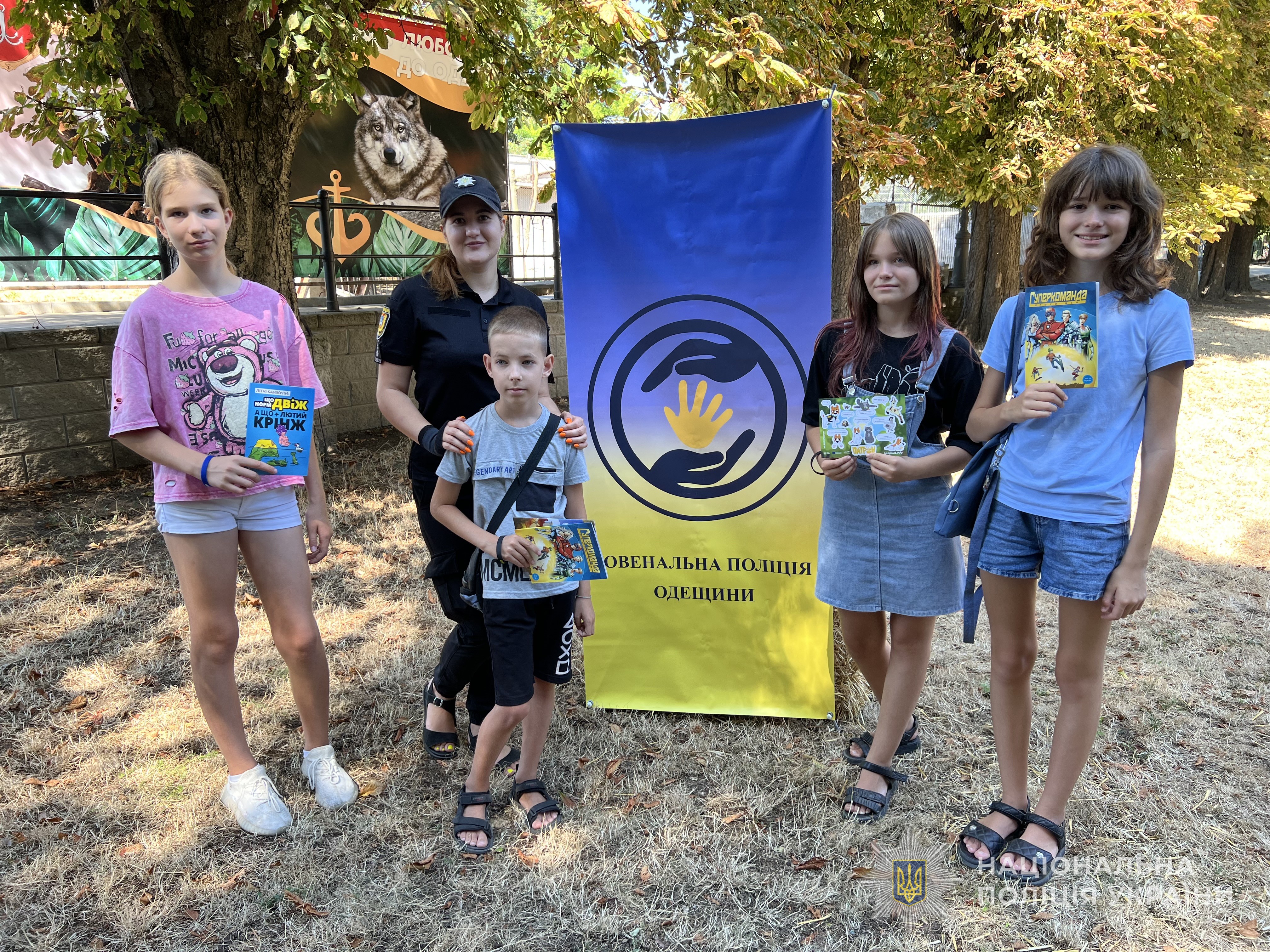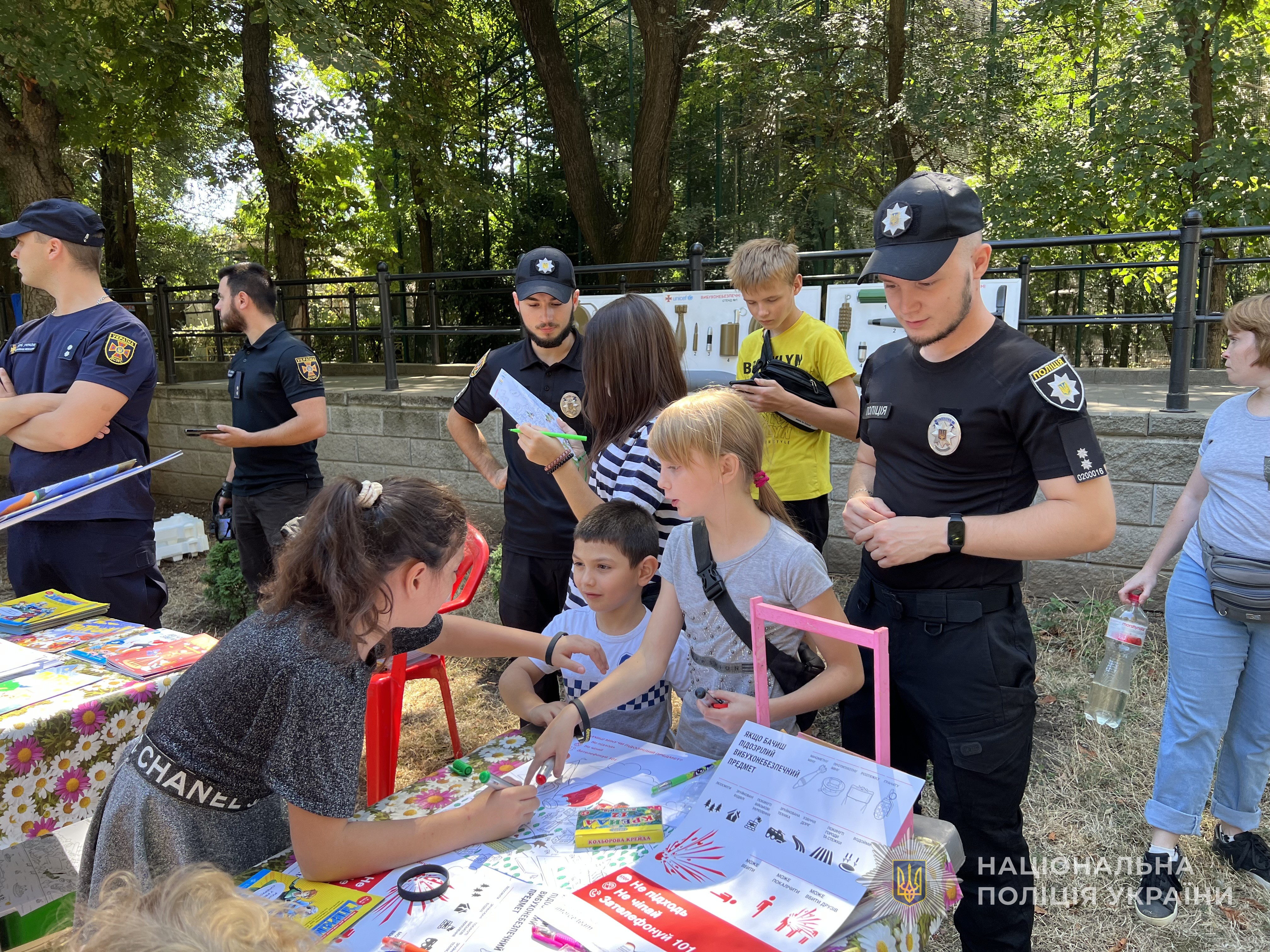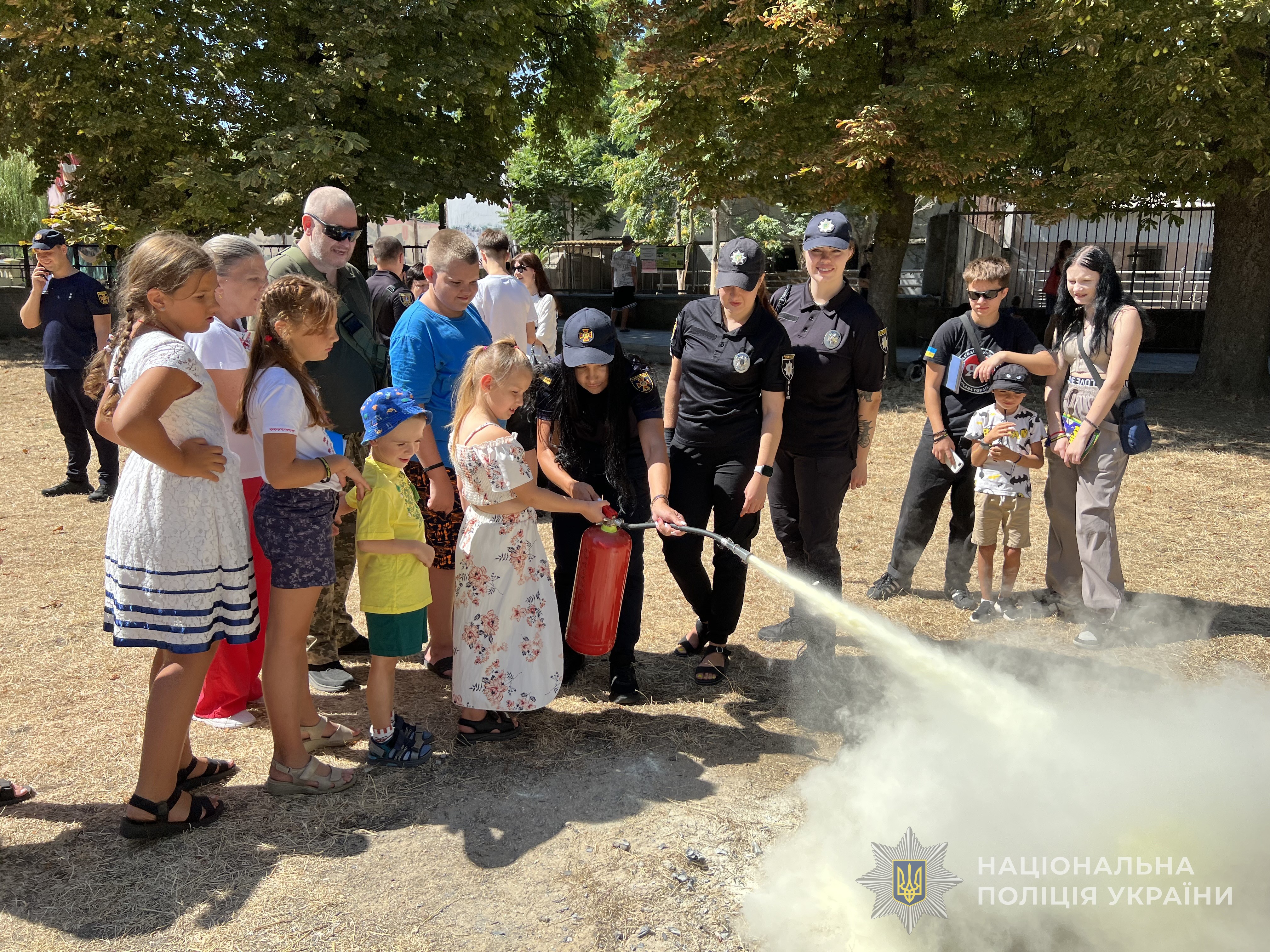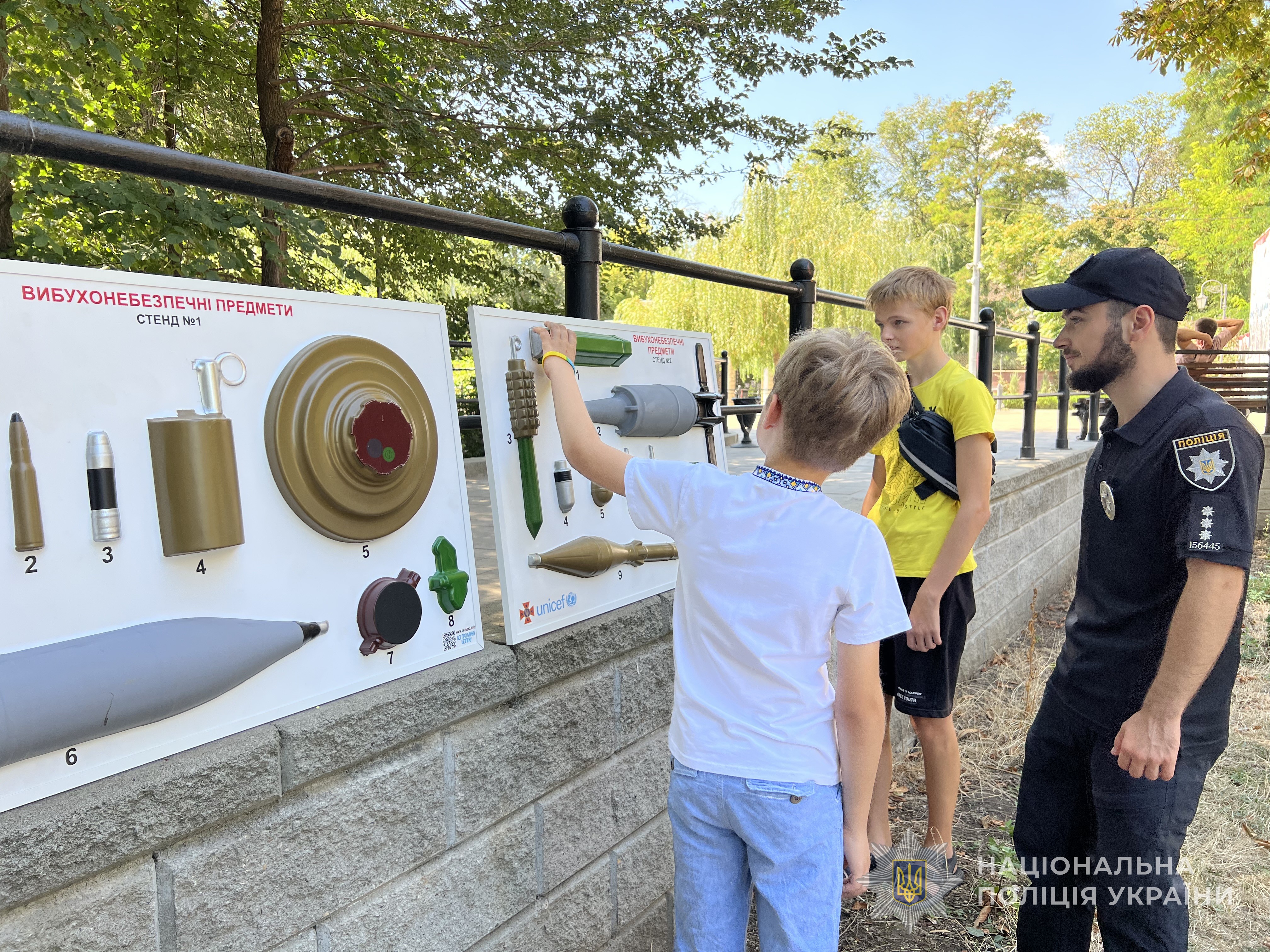 Ювенальні поліцейські роздали дітям світловідбивачі та пам’ятки щодо дотримання правил дорожнього руху й безпечної поведінки на водоймах. Поговорили про правила безпечної поведінки вдома, на вулиці та у школі, адже зовсім скоро розпочнеться новий навчальний рік. Окрему увагу поліцейські приділили питанню мінної безпеки. Пояснили, як діяти у разі виявлення вибухонебезпечних предметів: не торкатися їх, одразу повідомити дорослим або зателефонувати на спецлінію 102. Для кращого розуміння продемонстрували макети різних видів боєприпасів та розповіли, чому навіть знайдені на вулиці предмети, що нагадують іграшку, можуть бути небезпечними.