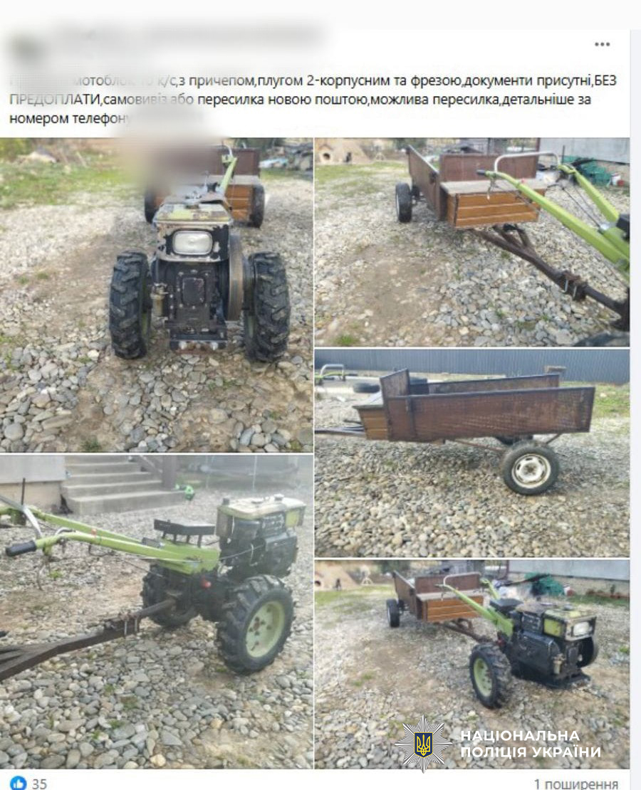 Також правопорушник розміщував в інтернеті фейкові оголошення про продаж легкового автомобіля, мотоблоків та дров, використовуючи фото з мережі. Спілкуючись із зацікавленими людьми, він запевняв їх в наявності товару та обіцяв доставку за умови повної передоплати. Транспортний засіб та дрова «продавець» мав доставити клієнтам на подвір’я, а мотоблоки – відправити поштою на вантажне відділення. Користуючись довірливістю жителів Одеської, Житомирської, Дніпропетровської, Волинської та Тернопільської областей, ув’язнений загалом збагатився за їхній рахунок на суму понад 95 тисяч гривень.