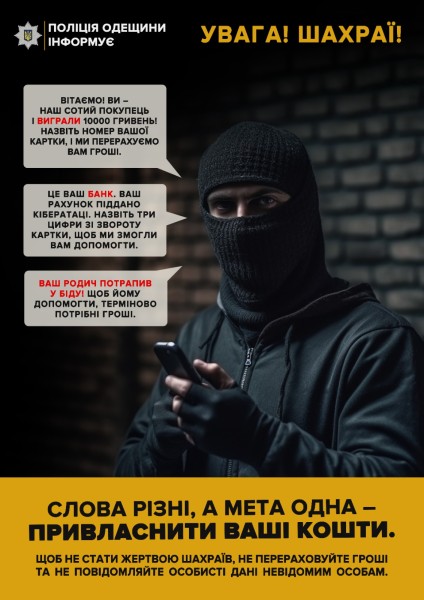 Правоохоронці Одещини вкотре застерігають громадян від шахраїв, радять завжди перевіряти отриману інформацію, а також проінформувати всіх своїх близьких, друзів, знайомих про аферистів, аби вони не потрапили на їхній гачок.
