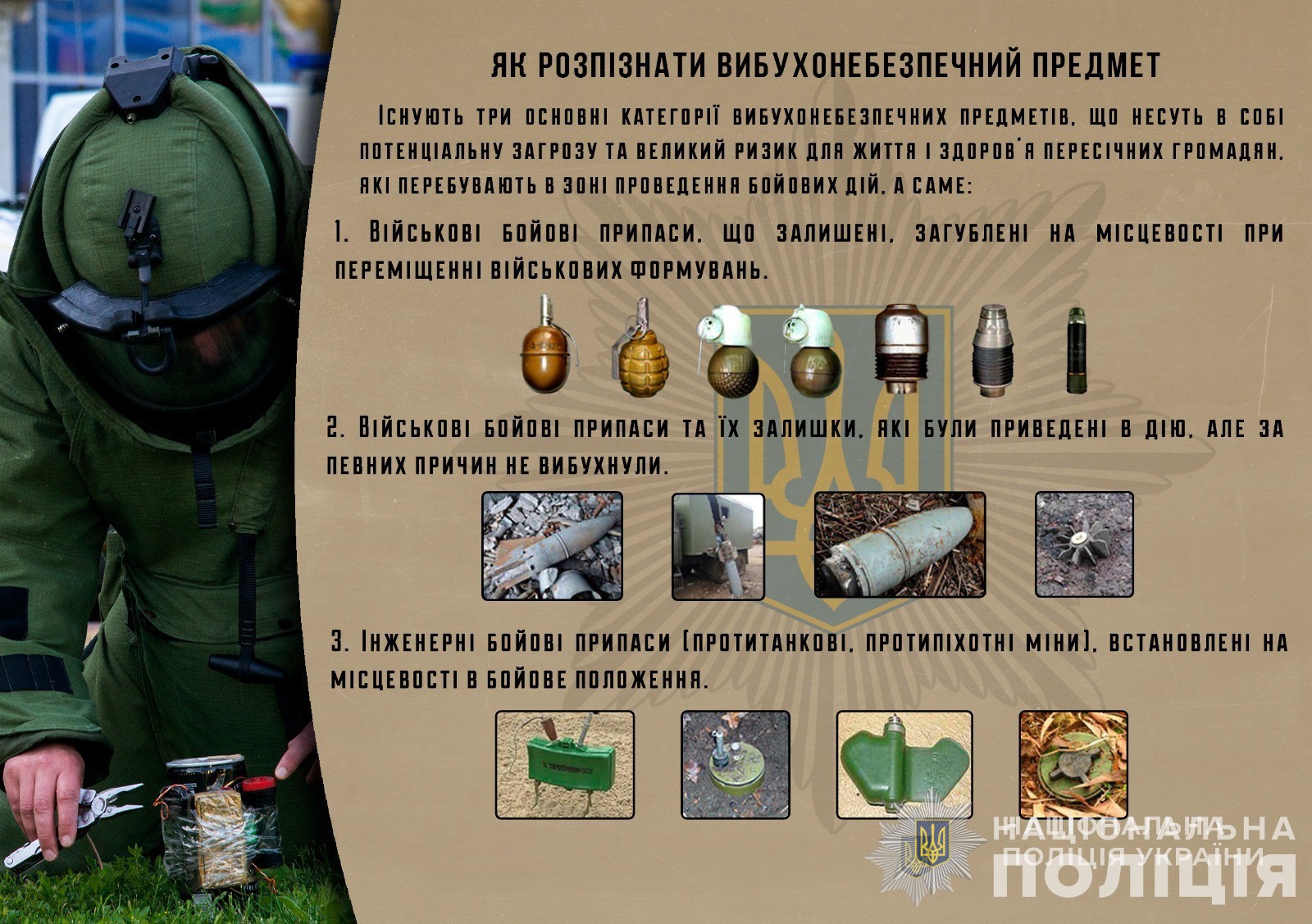 Існують чотири основні категорії вибухонебезпечних предметів, що несуть в собі потенціальну загрозу та великий ризик для життя і здоров'я пересічних громадян, які перебувають в зоні проведення бойових дій, а саме: