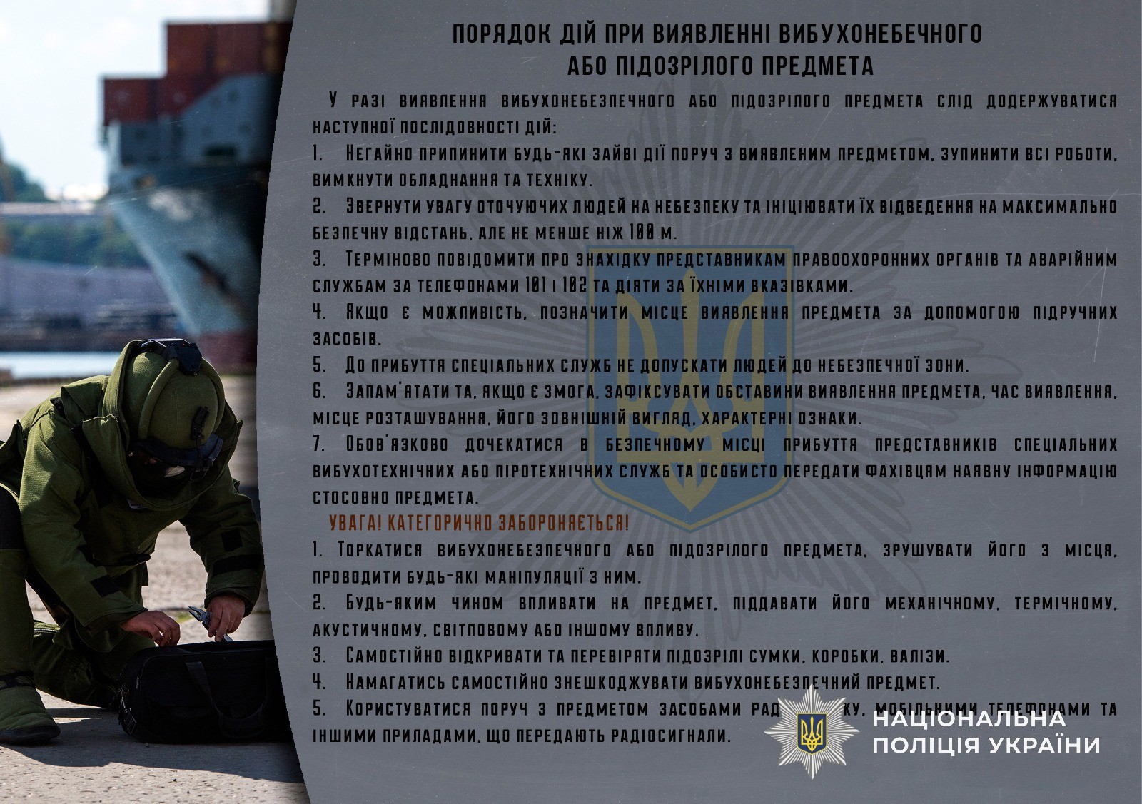 УВАГА! КАТЕГОРИЧНО ЗАБОРОНЯЄТЬСЯТоркатися вибухонебезпечного або підозрілого предмета, зрушувати його з місця, проводити будь-які маніпуляції з ним.