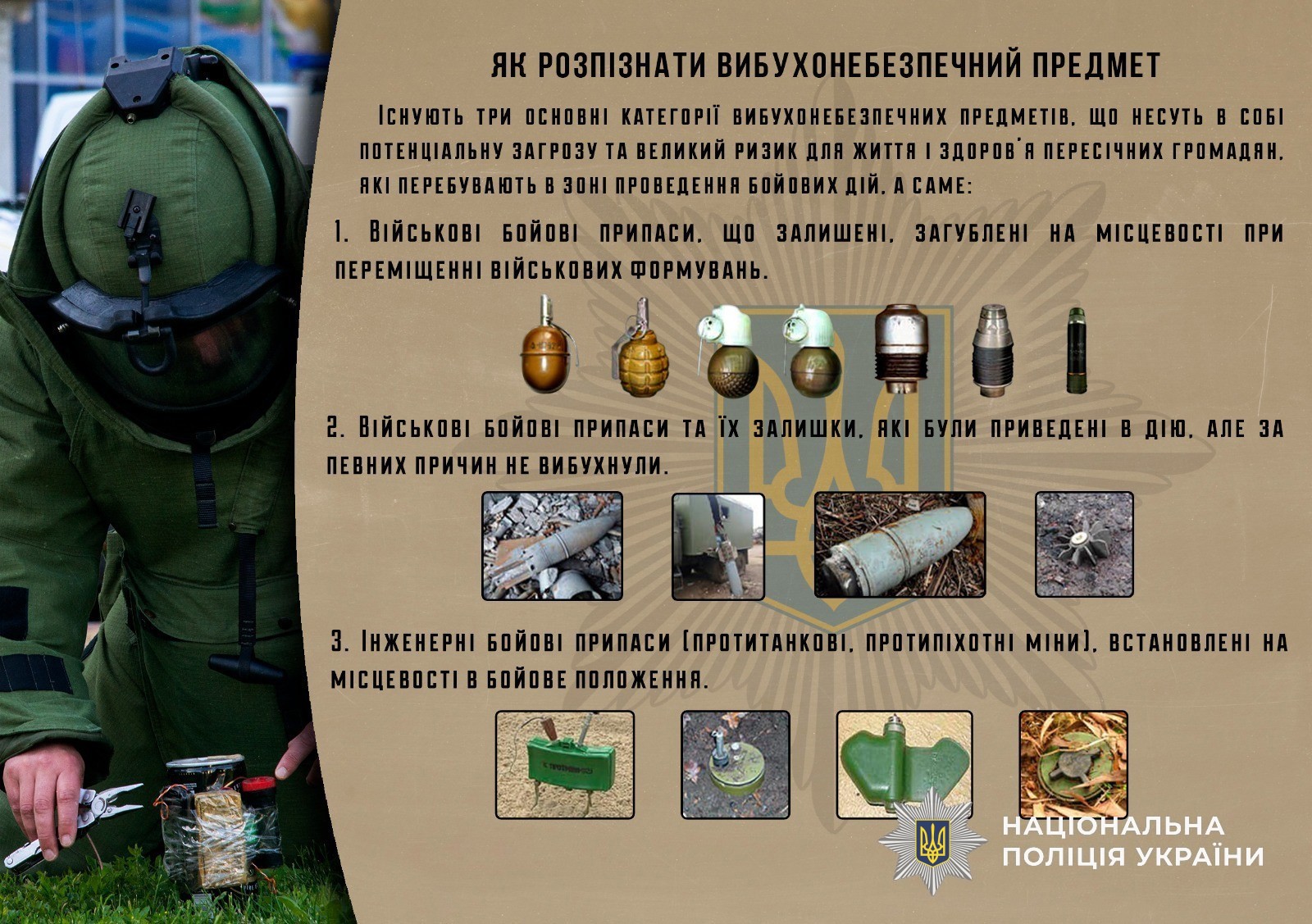 Існують чотири основні категорії вибухонебезпечних предметів, що несуть в собі потенційну загрозу та великий ризик для життя і здоров'я пересічних громадян, які перебувають в зоні проведення бойових дій, а саме:військові бойові припаси, що залишені, загублені на місцевості при переміщенні військових формувань;