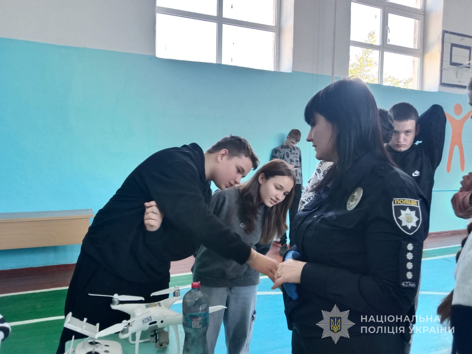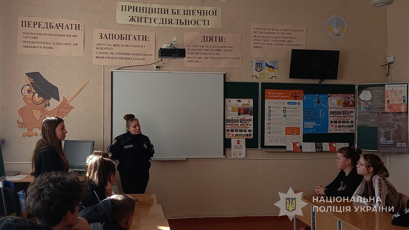 «Вам всім відомо, що в країні діє правовий режим воєнного стану і нам слід дотримуватись комендантської години, порядку дій під час повітряної тривоги, не фіксувати на мобільні пристрої та не поширювати місця обстрілів та розташування режимних об’єктів»,- нагадала школярам офіцер поліції.