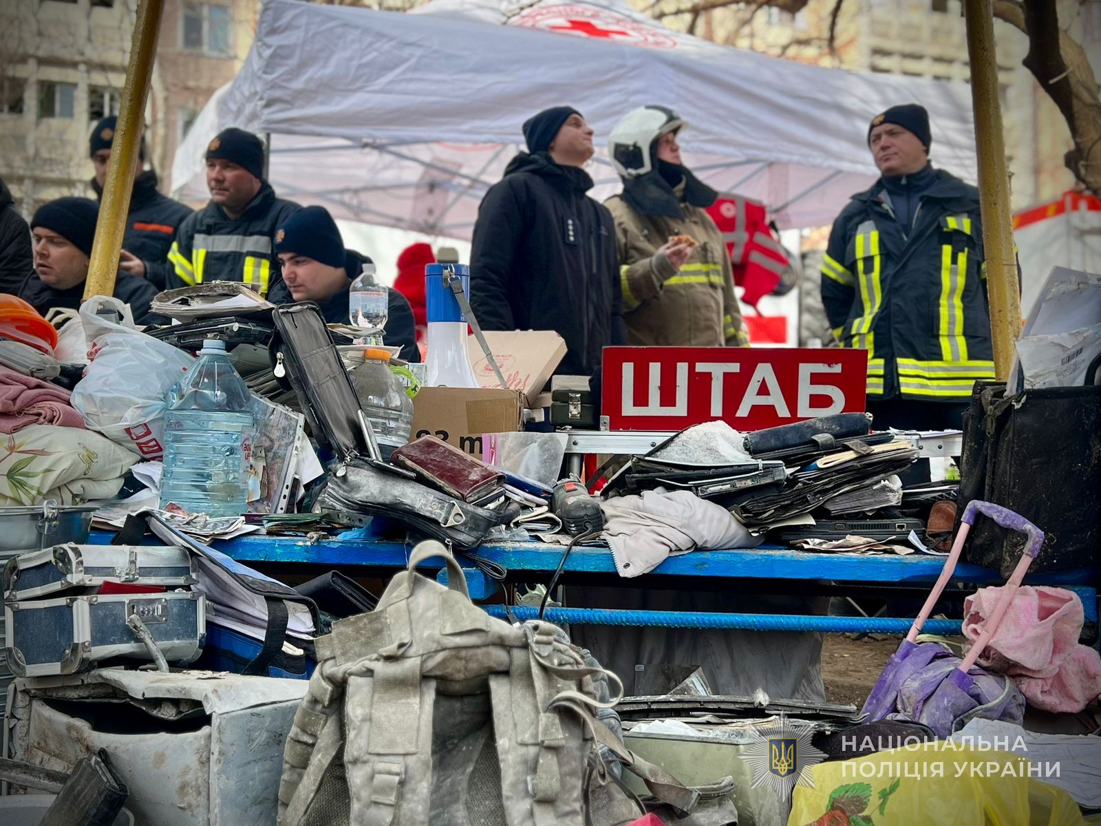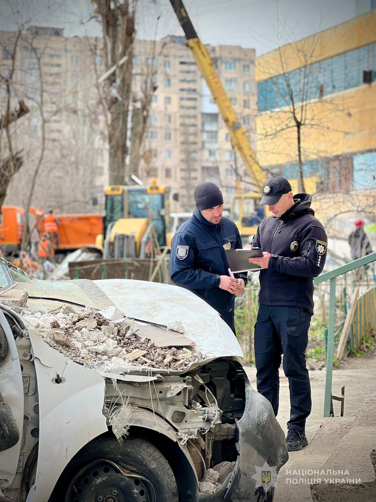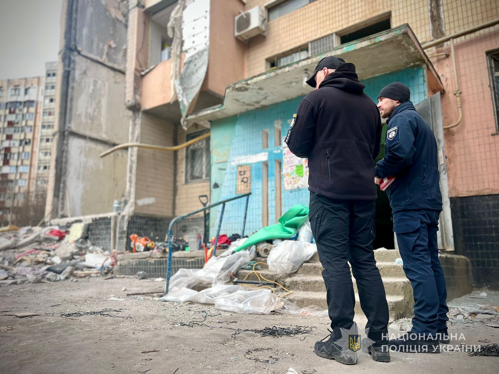 Поліцейські продовжують збирати докази та документувати наслідки російського злочину. Слідчі, оперативники, дільничні офіцери, працівники інших підрозділів поліції з перших хвилин працюють на місці події. Оглядають та фіксують зруйноване та пошкоджено майно, встановлюють, опитують свідків та постраждалих, охороняють та забезпечують правопорядок на місці події, надають іншу необхідну, у тому числі психологічну, допомогу містянам.