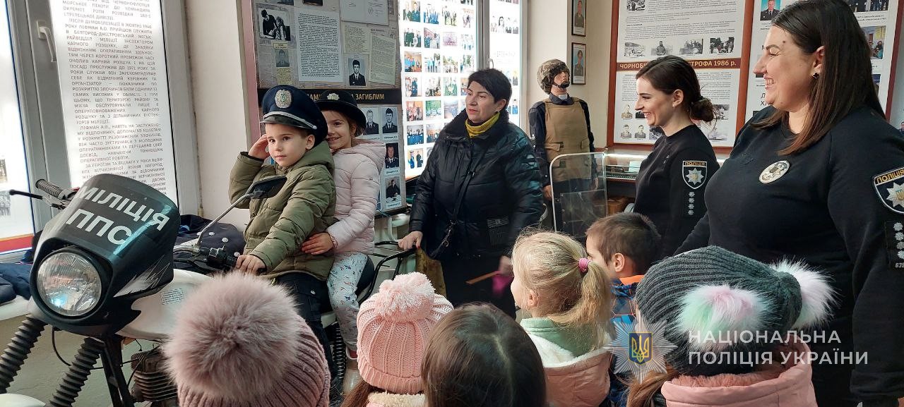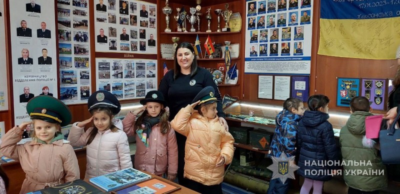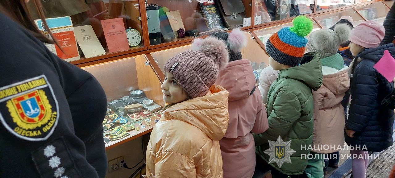 На початку зустрічі старша інспекторка ювенальної превенції Оксана Квачук та поліцейський офіцер Білгород-Дністровської громади Марина Боб запросили вихованців міського дитячого садочка до філіалу музею Головного управління Національної поліції в Одеській області, де розповіли історію розвитку правоохоронних органів регіону з моменту заснування до сьогодення.