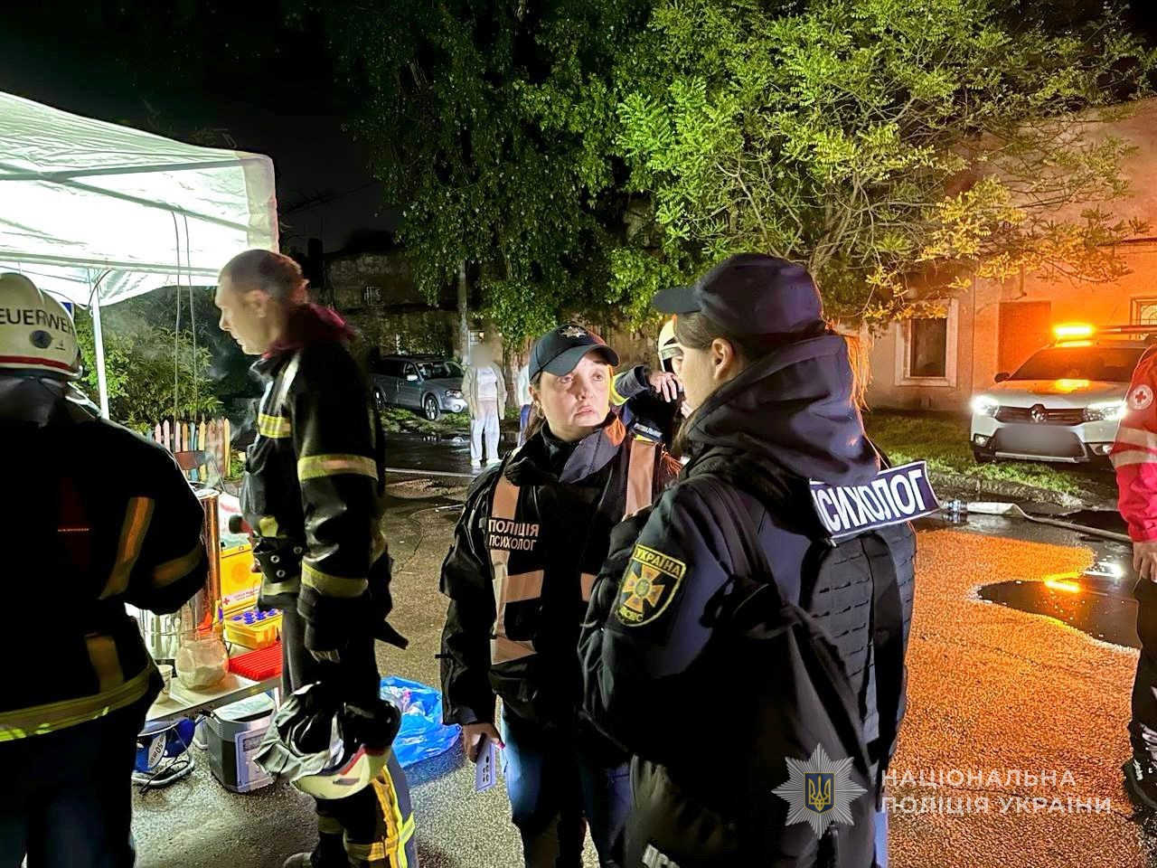 Зараз там працюють правоохоронці та інші служби. Сформовано оперативний штаб для розселення і надання допомоги містянам. Поліцейські фіксують наслідки ворожої атаки, збирають докази військового злочину росії, опитують громадян, надають їм психологічну допомогу, забезпечують правопорядок.