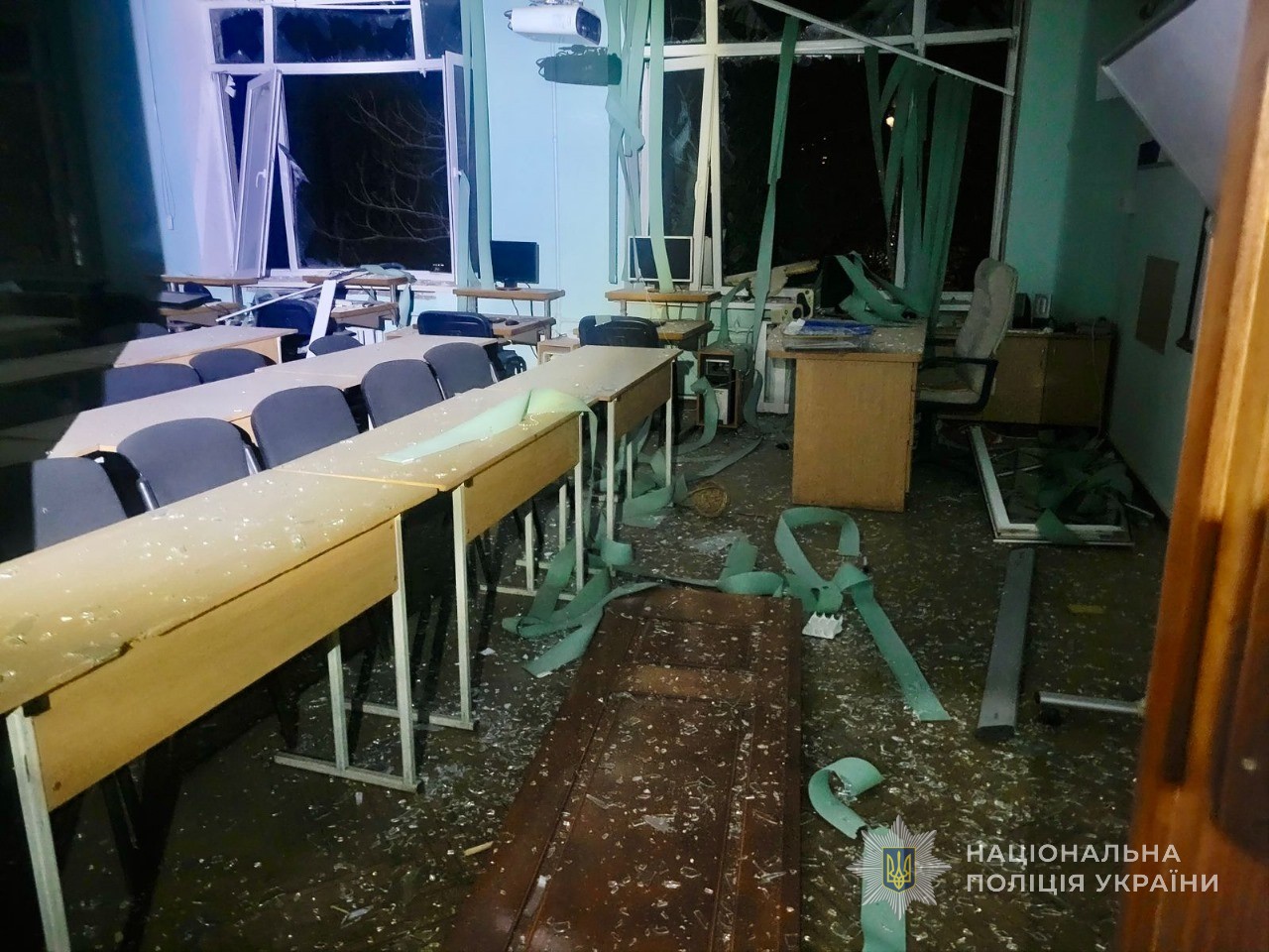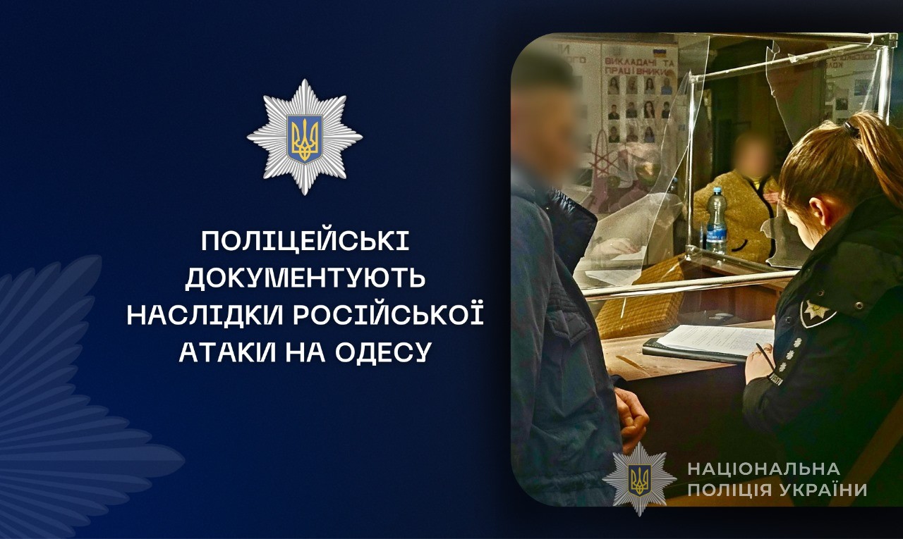 На місцях слідчо-оперативні групи ГУНП в Одеській області фіксують наслідки ворожої атаки, збирають докази військового злочину російської федерації, опитують громадян, надають психологічну допомогу учням коледжу, забезпечують правопорядок.
