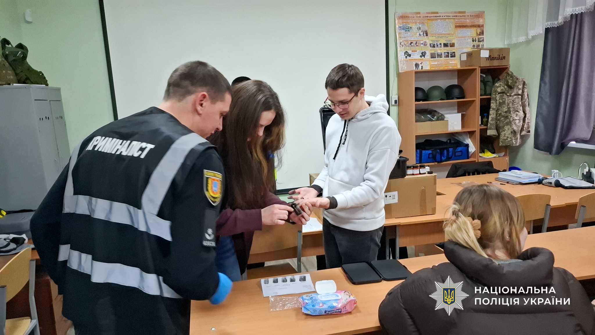 Підлітки дізналися, що криміналісти виїжджають на місця злочинів, де збирають речові докази. Їм показали спеціальне криміналістичне обладнання, зокрема засоби для виявлення, фіксації та вилучення різних слідів, речовин і речей, а також аеротехніку для обстеження території з висоти, коли йдеться про велику протяжність, важко дістатися до потрібного місця або небезпечно.