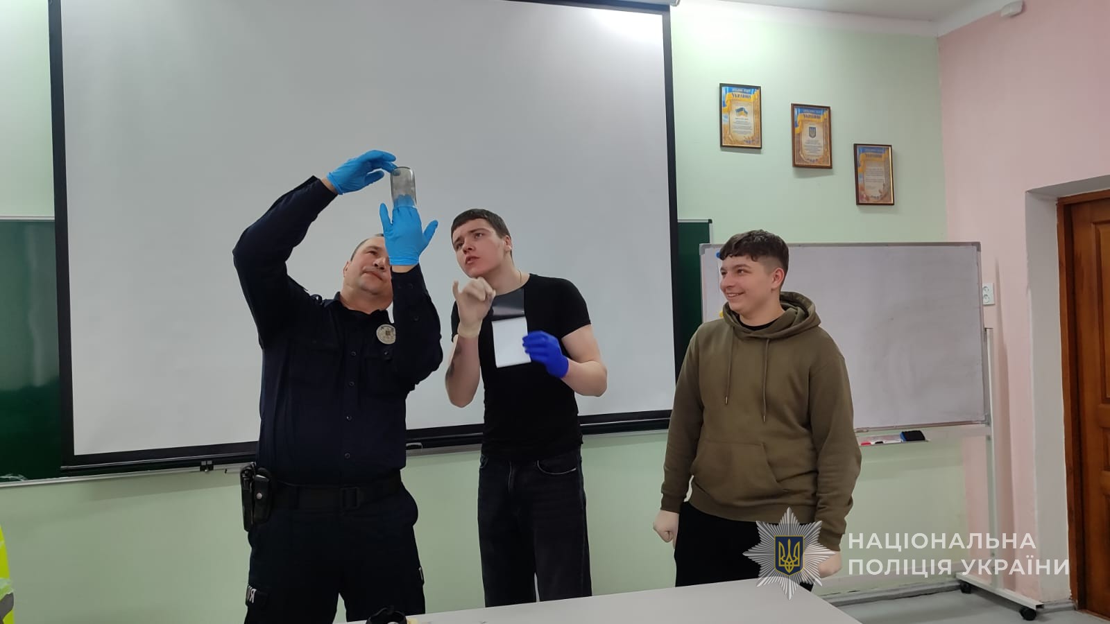 Особливий захват в учнів викликала робота криміналістів. Спеціаліст розповів про свою професію, показав обладнання та пояснив, як збирає і зберігає докази, а також дав змогу спробувати себе в ролі молодих криміналістів.