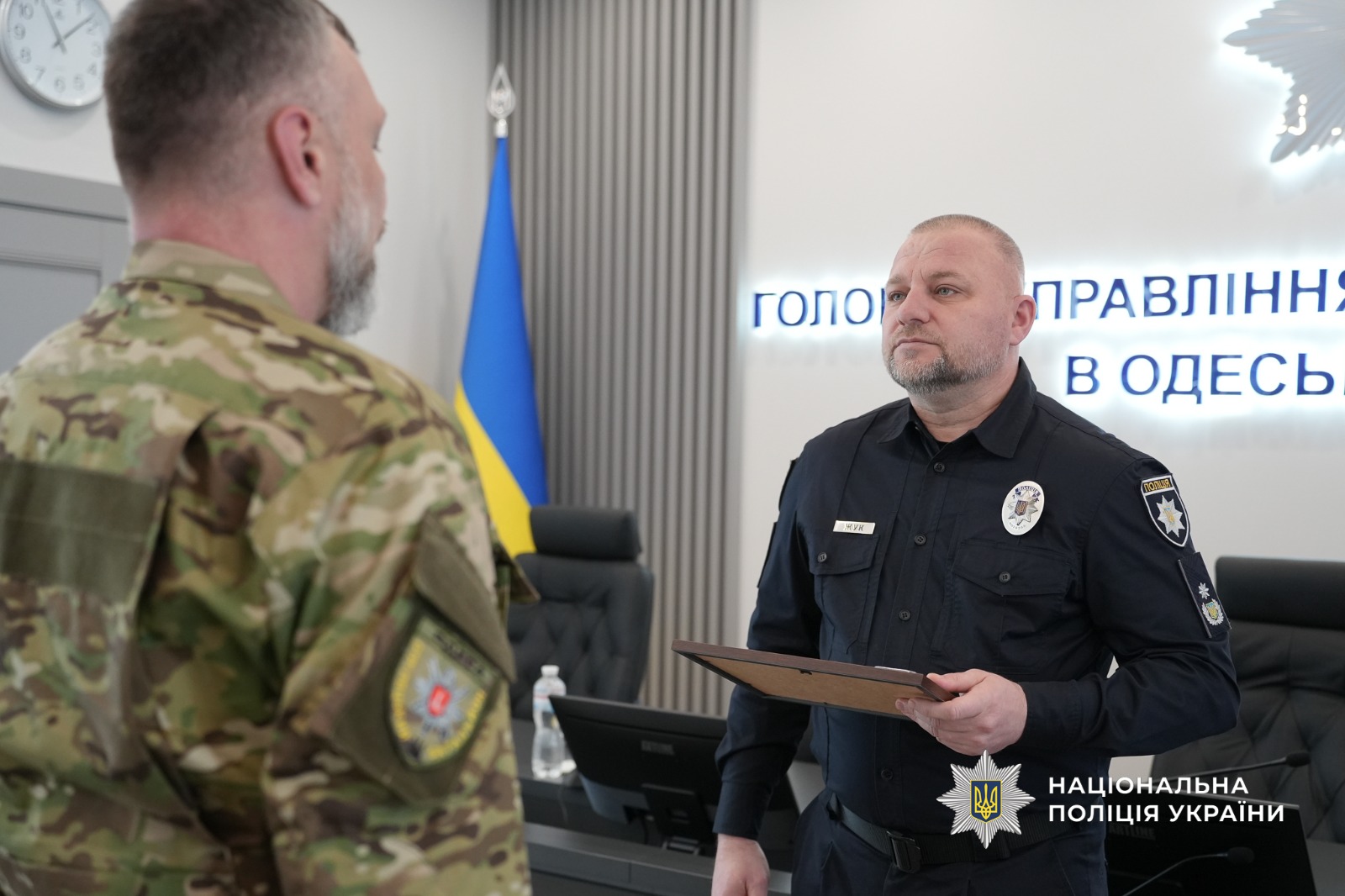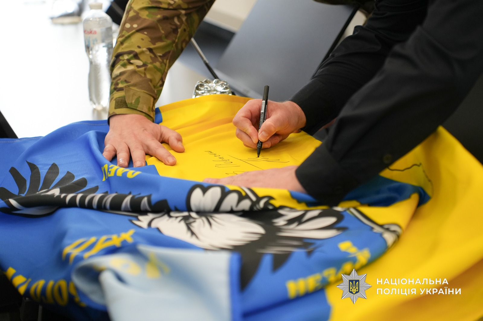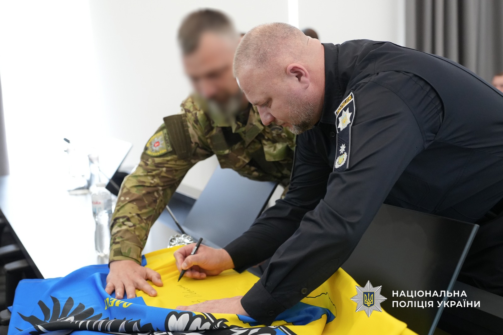 Наприкінці заходу бійці звернулися до очільника поліції Одещини з проханням підписати бойовий прапор, який був разом із ними на передовій.
