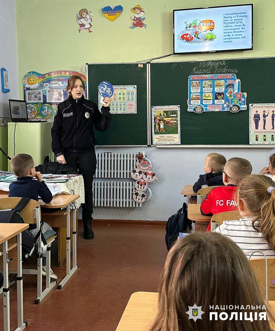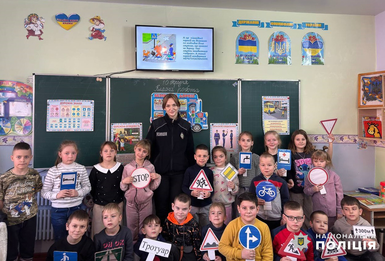 Приміром, офіцерка служби освітньої безпеки Тетяна Сулім під час уроку на тему «Безпечна дорога до школи» нагадала, що пішоходи повинні ходити тротуарами, переходити вулицю у визначених місцях та не забувати звертати увагу на дорожні знаки.