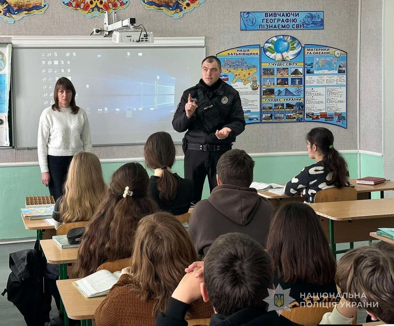 У навчальних закладах правоохоронці провели з учнями обговорення різних тем. Зокрема, з нагоди Дня української жінки, який відзначається 25 лютого, говорили про досягнення українських жінок та їхній внесок у справу захисту та безпеки нашої країни. Наводили різні приклади від козачок до співробітниць Національній поліції України.