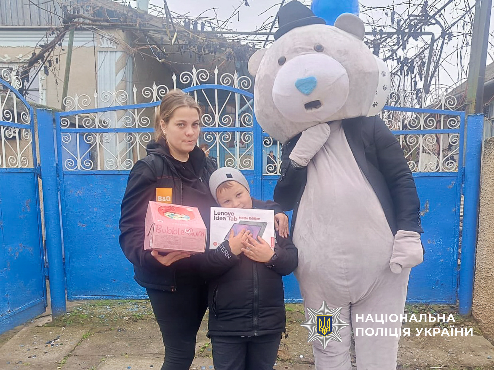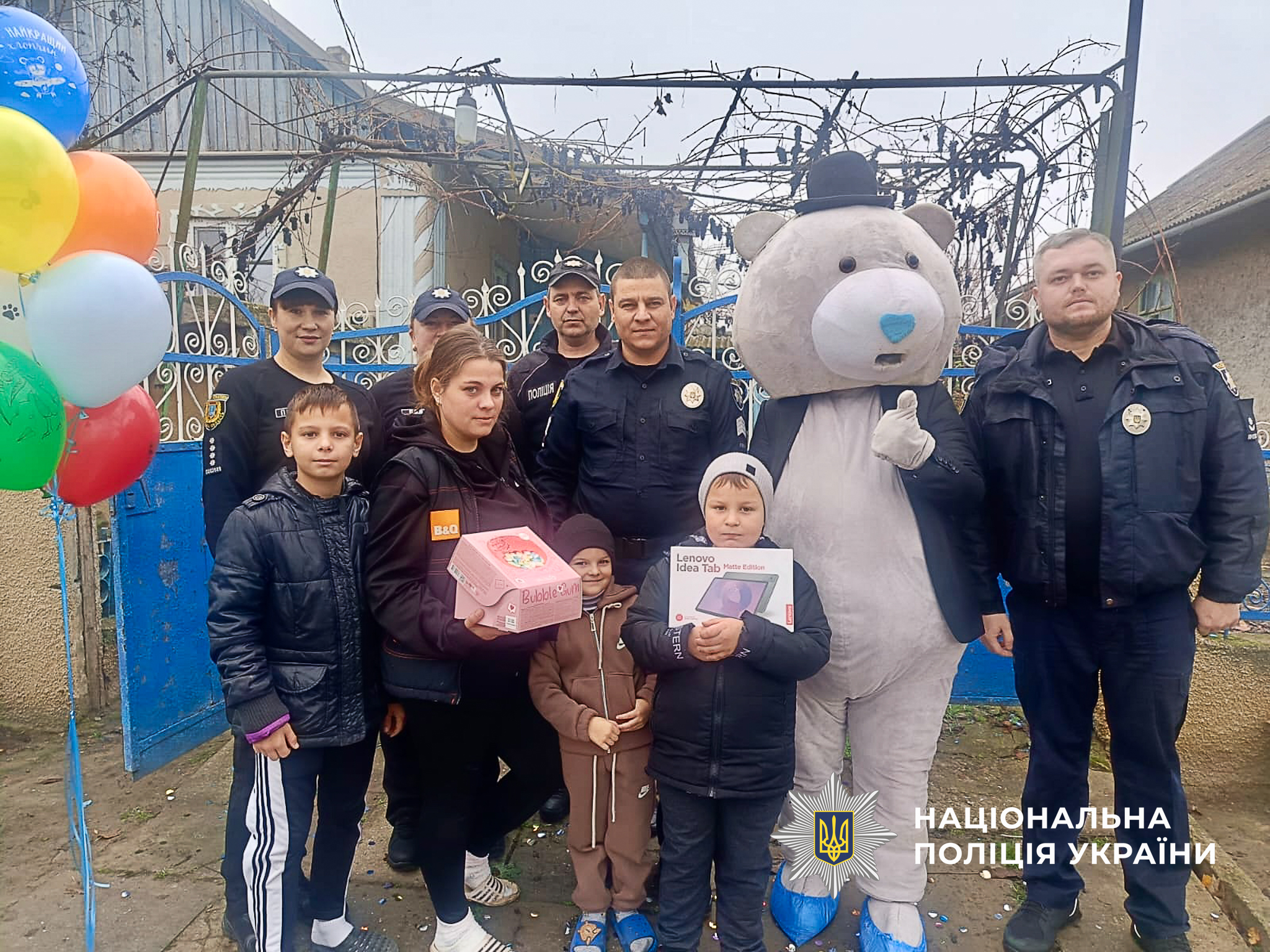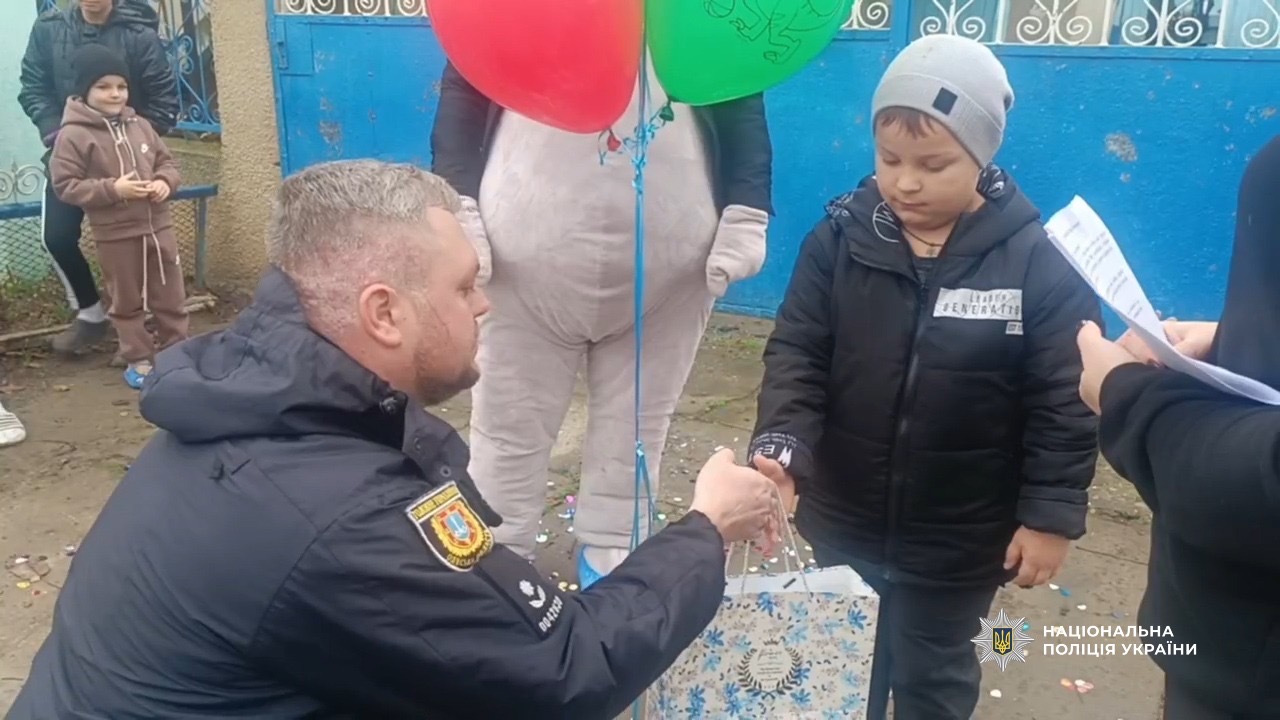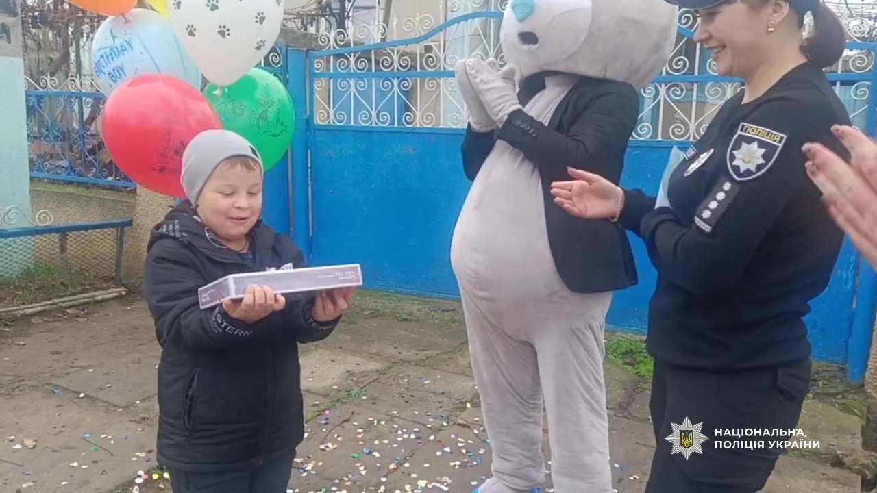Микита навчається у першому класі, тому поліцейські подарували йому сучасний планшет для навчання. Також поліцейські запросили казкового героя – великого ведмедика, який розважав та вітав дитину. Святковий торт, солодощі та яскраві кульки додали дому справжньої атмосфери дитячого свята.