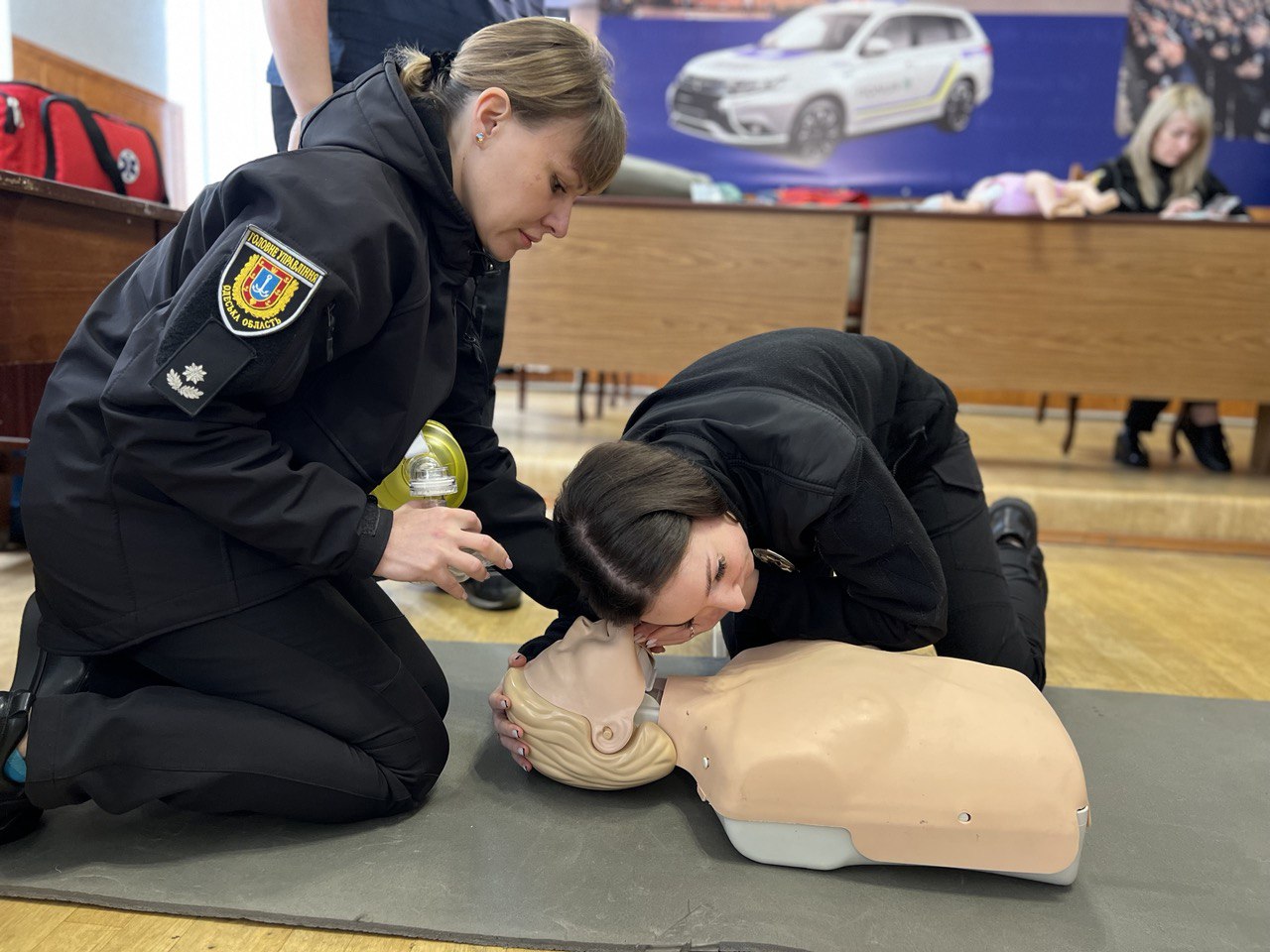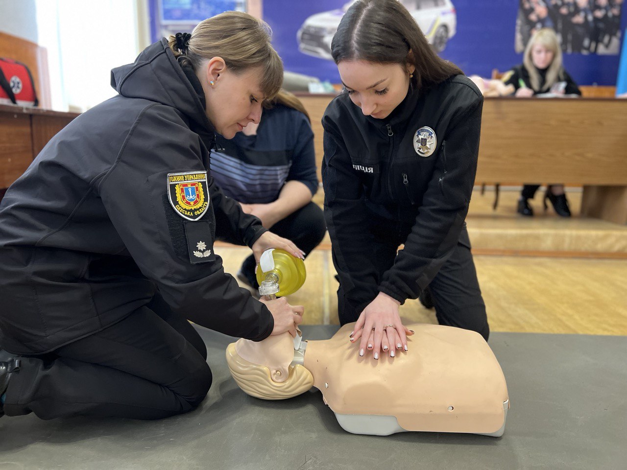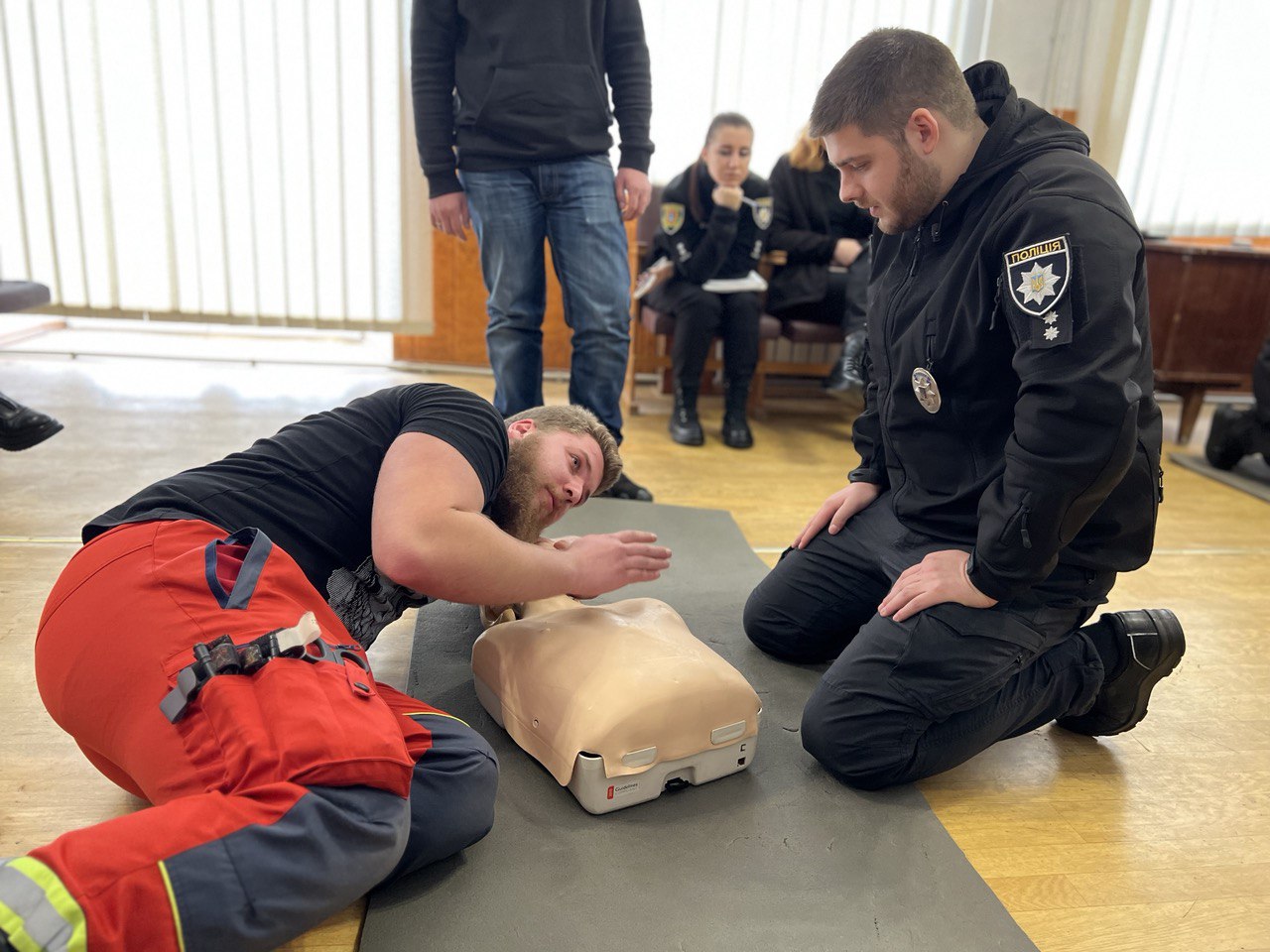 Разом із фахівцями поліцейські відпрацювали уніфікований протокол надання першочергової невідкладної медичної допомоги дорослим та дітям. Зокрема правоохоронці провели серцево-легеневу реанімацію, у тому числі з використанням автоматичного зовнішнього дефібрилятора, а також попрактикувалися у звільненні дихальних шляхів від сторонніх предметів.