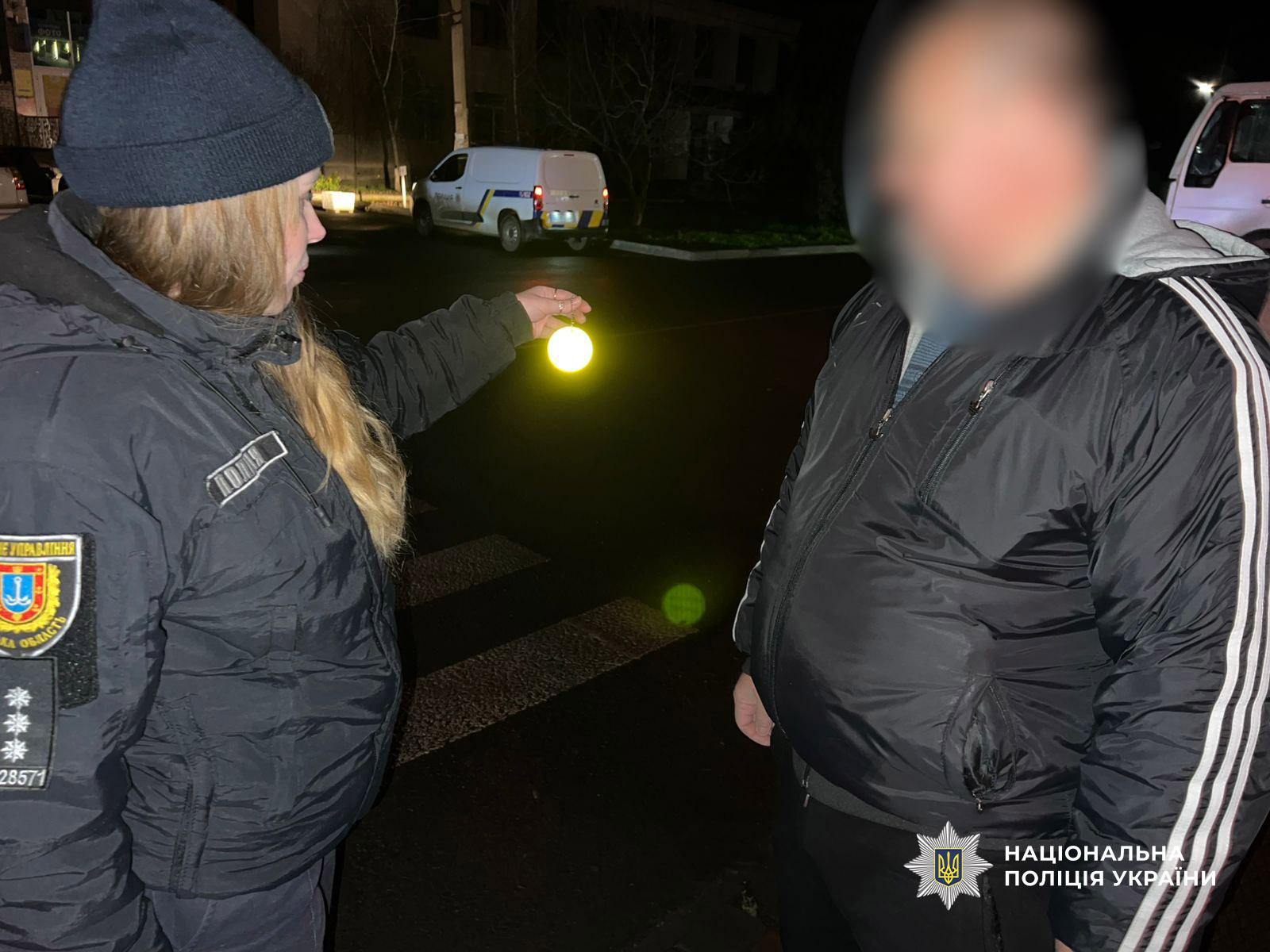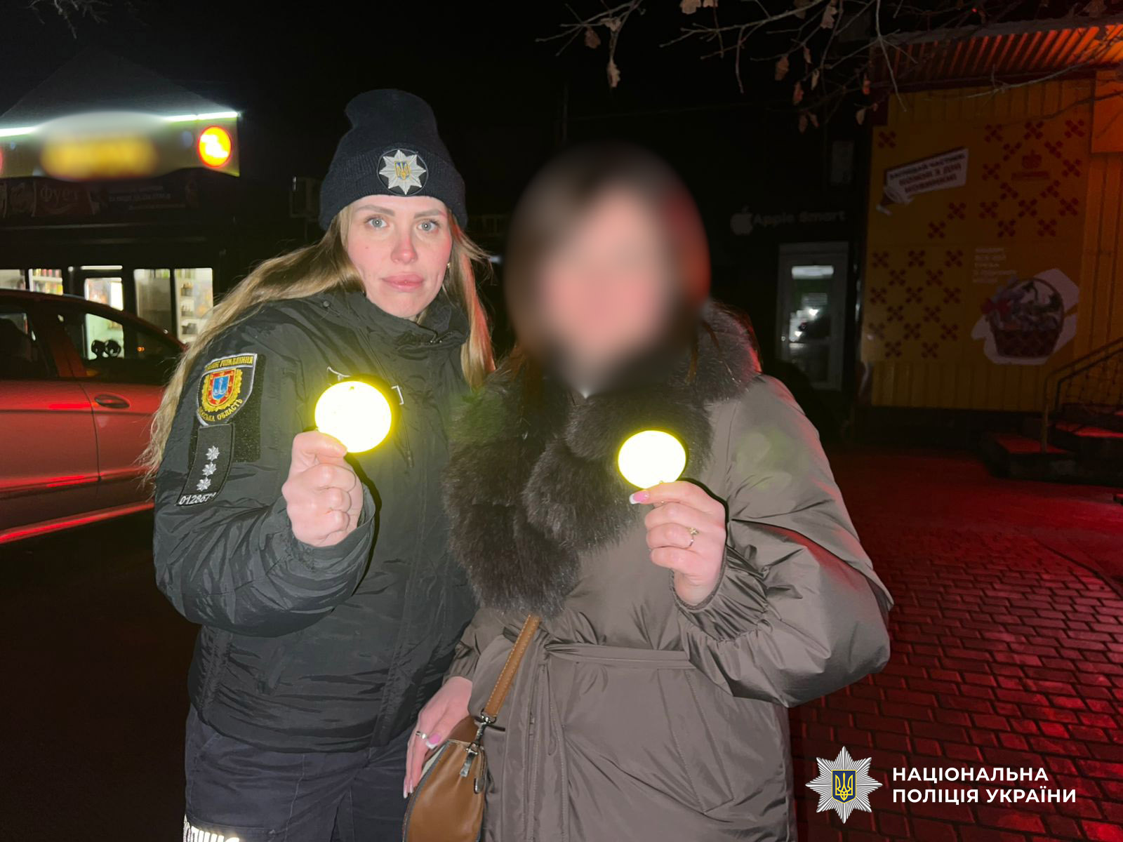 Поліцейська наголошувала: помітність пішоходів на дорозі значно підвищують світлий одяг та світловідбивні елементи, розміщені на одязі, взутті, сумках чи наплічниках. Вона демонструвала, як працюють флікери і дарувала їх громадянам, закликаючи обов’язково користуватися ними в темну пору доби та в умовах недостатньої видимості, коли рухатимуться проїзною частиною чи узбіччям. Це одна з вимог, прописаних у Правилах дорожнього руху.