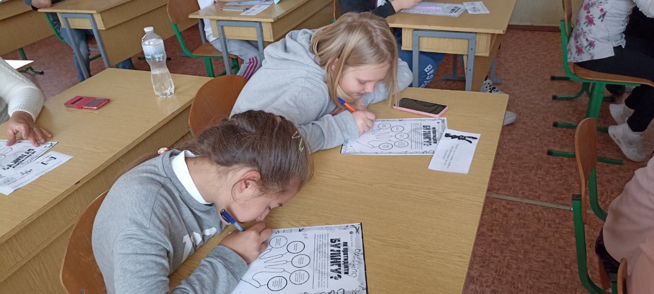 Закріплювали знання з протидії булінгу за допомогою ігор: учні мали вигадати, як захистити однокласника від цькування, та запропонувати свої заходи з протидії ним.