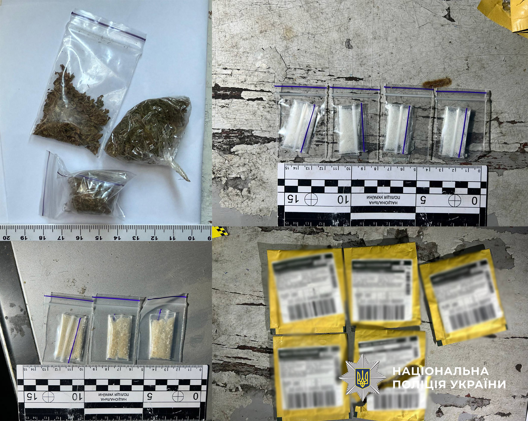 Під час проведення слідчих заходів з фігурантом, у тому числі за місцем його мешкання, слідчі вилучили засоби зв’язку, пакувальний матеріал, ваги, наркотичні засоби, обіг яких обмежено – канабіс та метадон, психотропну речовину, обіг якої обмежено – амфетамін, особливо небезпечні психотропні речовини, обіг яких заборонено – MDMА та PVP, а також кастет, який, за висновком експерта, відноситься до категорії контактної неклинкової холодної зброї ударно-дробильної дії.