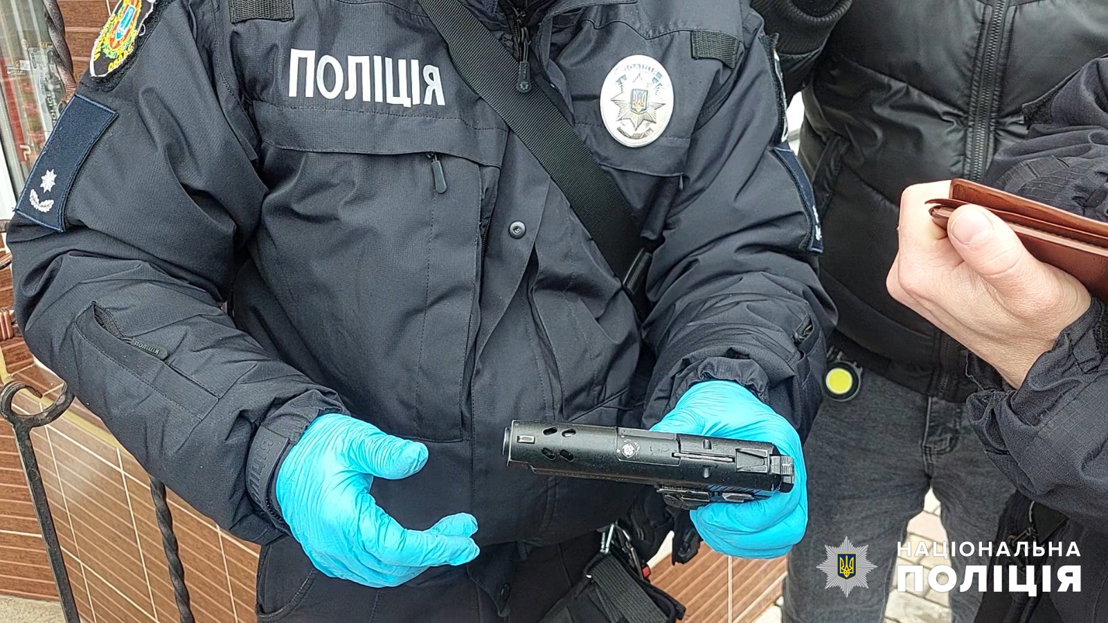 Поліцейські затримали правопорушника в процесуальному порядку після отримання ним грошей. Окрім речових доказів, що стосуються вимагання, у чоловіка вилучили стартовий пістолет, перероблений у гладкоствольну вогнепальну зброю, з 34 набоями, виготовленими промисловим способом. Походження зброї та боєприпасів було підтверджено висновком судово-балістичної експертизи. Дозвільних документів на них не було.