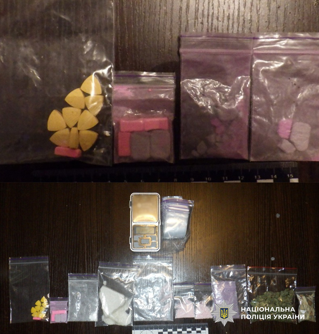 Під час обшуку за місцем мешкання затриманого та у квартирі знайомої, де він зберігав свої речі, слідчі вилучили загалом 35 полімерних пакетиків із наркотиками, психотропними та особливо небезпечними психотропними речовинами. Експертними висновками встановлено їх належність до канабісу, кокаїну, амфетаміну, псилоцибінових грибів, МDMA, 4-MMC та ПМА. Усе це зловмисник зберігав у великих та особливо великих розмірах з метою подальшого збуту наркозалежним особам в Одесі.