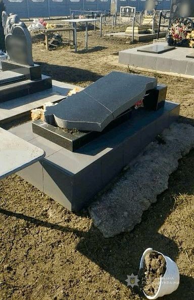 Чоловік у стані алкогольного сп’яніння вдень, після застілля в одному із місцевих барів, пішов на кладовище, де пошкодив 10 пам’ятників. Зі слів правопорушника, будь-яких неприязних стосунків як із померлими за їх життя, так і їхніми родинами у нього не було, і зробив він це заради розваги.