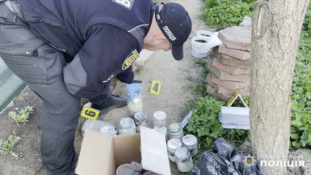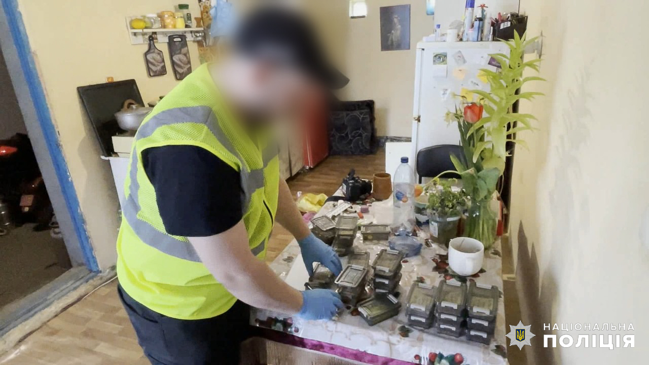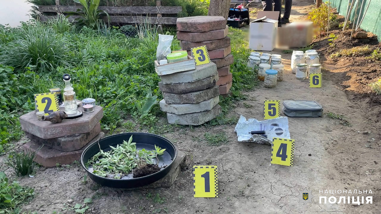 У домоволодінні правопорушниці було проведено санкціонований обшук та вилучено хімічне обладнання, прекурсори, пакувальний матеріал, візитівки, зелені насадження конопель та різні ємності з наркотичними засобами та психотропними речовинами, серед яких канабіс, екстракт канабісу та гриби.