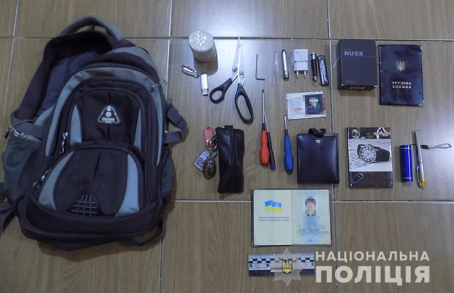 Поліцейським знадобилось всього кілька годин, щоб встановити особу та затримати злодія. Під час відпрацювання області його виявили на одній із вулиць міста. У підозрюваного вилучили викрадені речі, які він склав у дорожню валізу. При огляді особистих речей у чоловіка також виявили спеціальні пристрої для відчинення вікон та дверей.