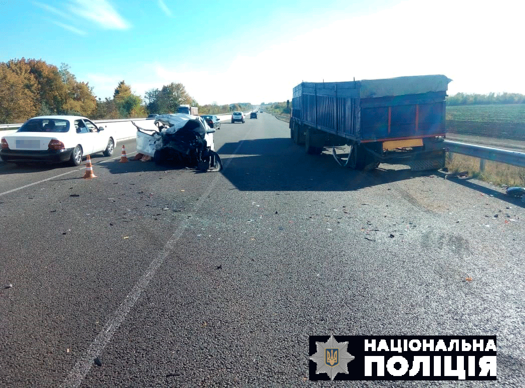 На місці події працює слідчо-оперативна група по ДТП. Попередньо встановлено, що водій легковика не впорався з керуванням та здійснив зіткнення з вантажівкою, яка стояла на узбіччі.