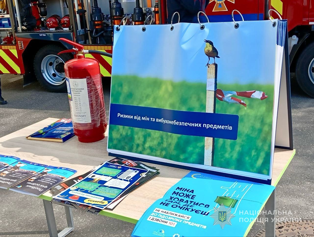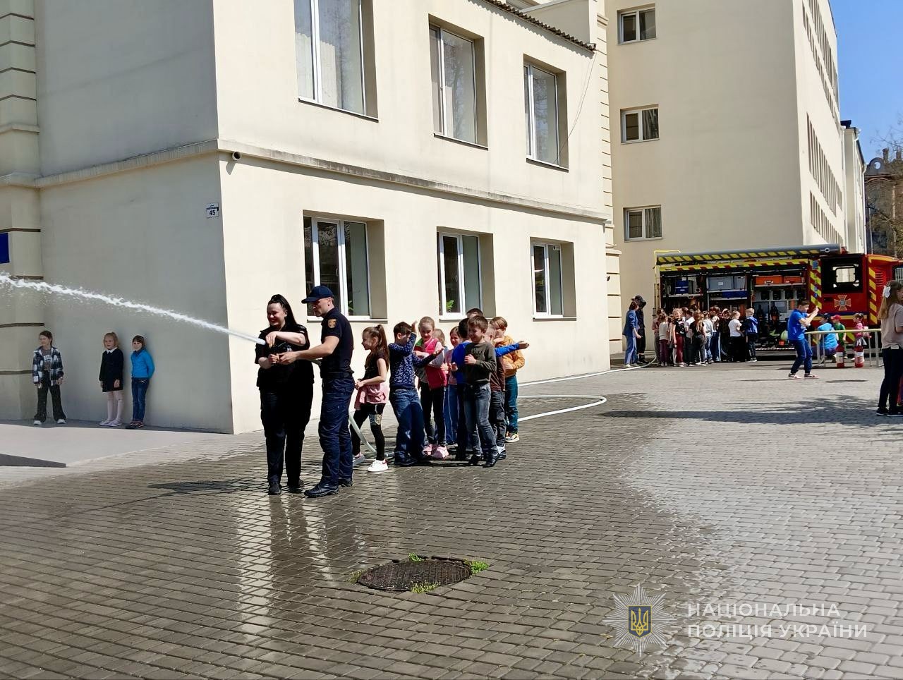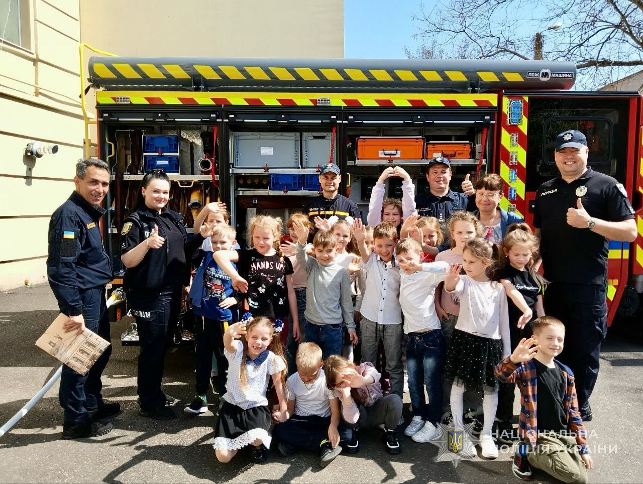 Також правоохоронці показали дітям, як користуватися вогнегасниками. Хлопці та дівчата отримали інформаційні пам’ятки, приміряли спорядження своїх гостей, посиділи у службовому транспорті, випробували в дії поліцейську радіостанцію та зробили пам’ятні фото.