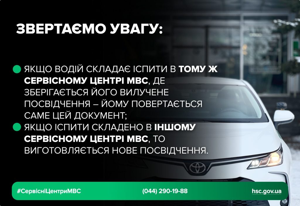 - якщо водій складає іспити в тому ж сервісному центрі МВС, де зберігається його вилучене посвідчення – йому повертається саме цей документ;