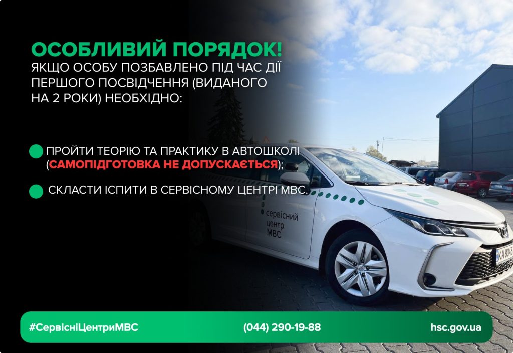 Особливий порядок стосується осіб, яких було позбавлено права керування під час дії першого посвідчення, виданого на два роки. У такому випадку необхідно повторно пройти повний курс навчання в акредитованій автошколі, а потім – знову скласти іспити в сервісному центрі МВС. Якщо іспити складено успішно, посвідчення знову видається на два роки.